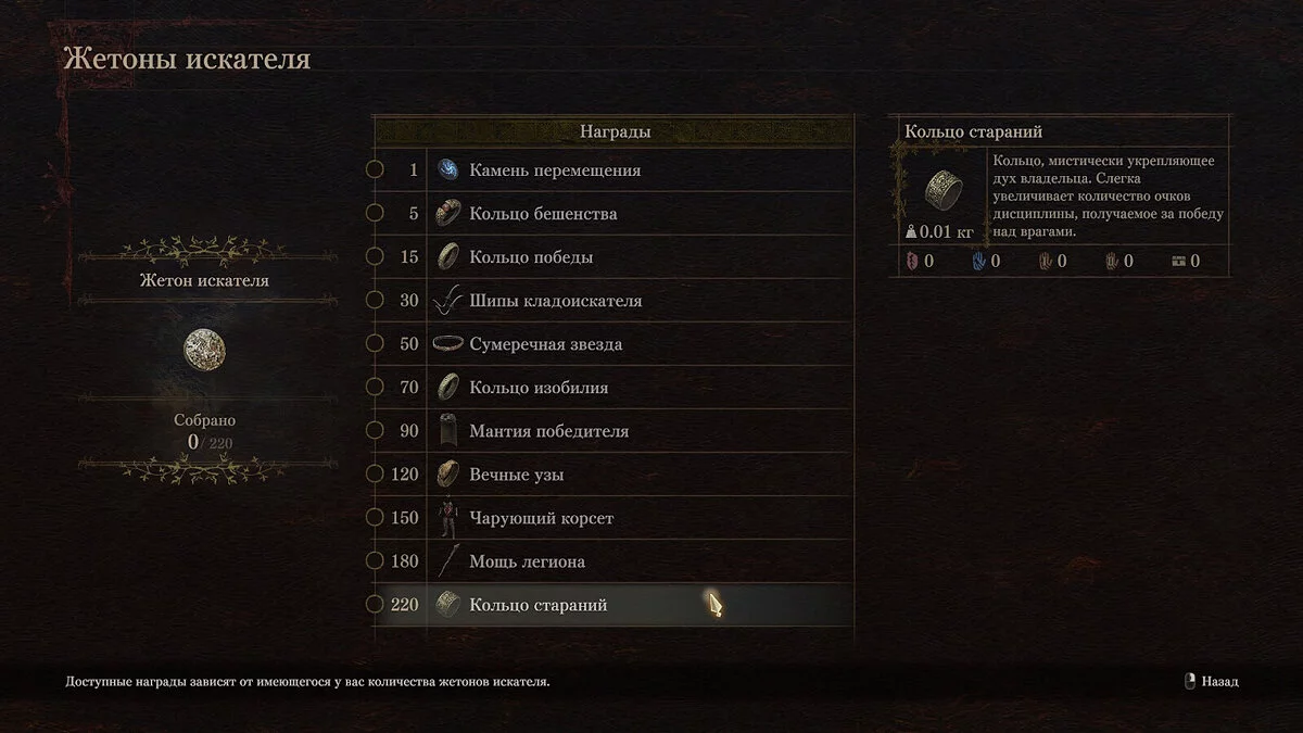 - 220 жетонов — Кольцо стараний. Немного повышает количество очков дисциплины (ОД), получаемых за победу над противниками.