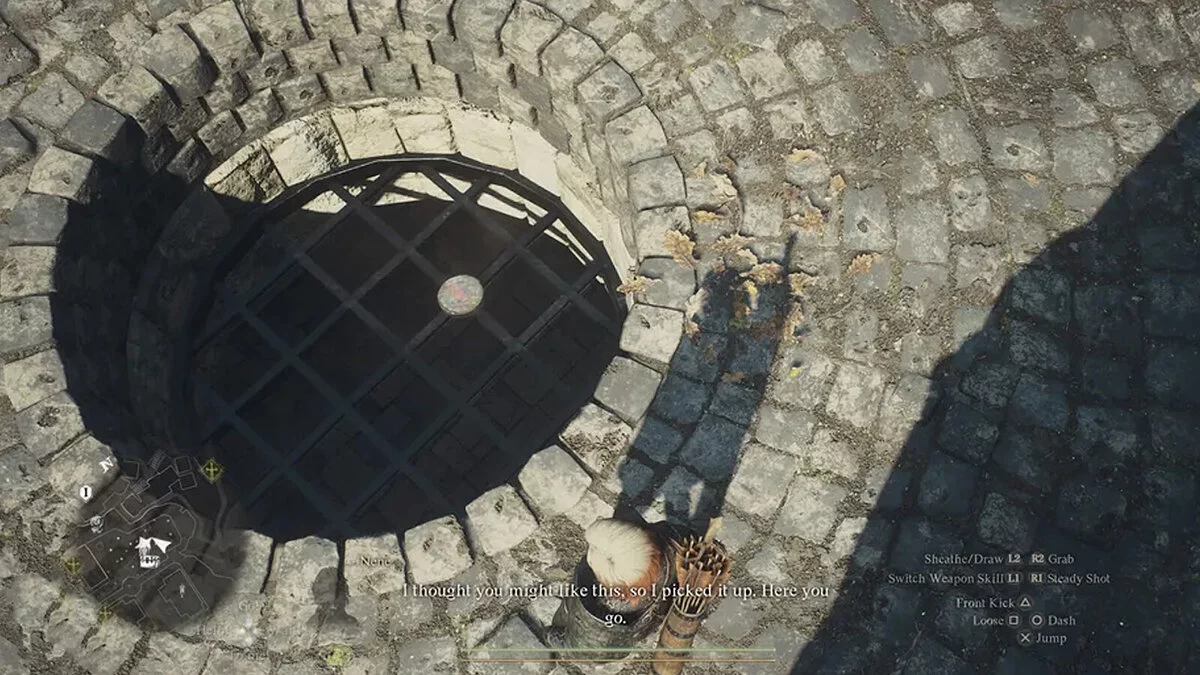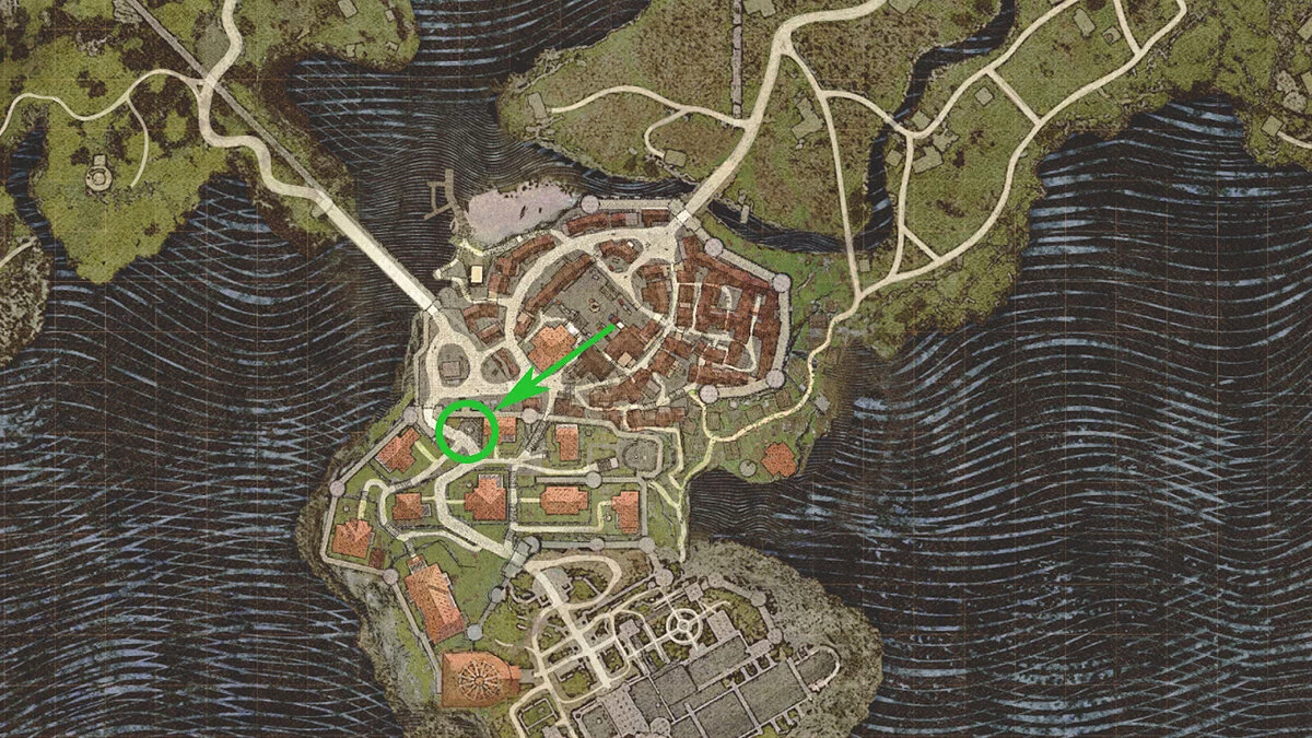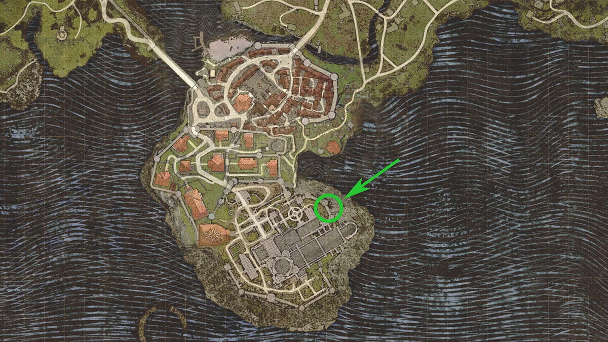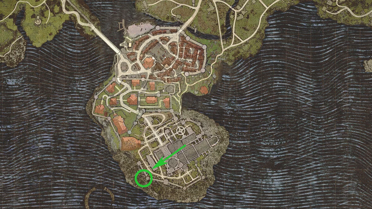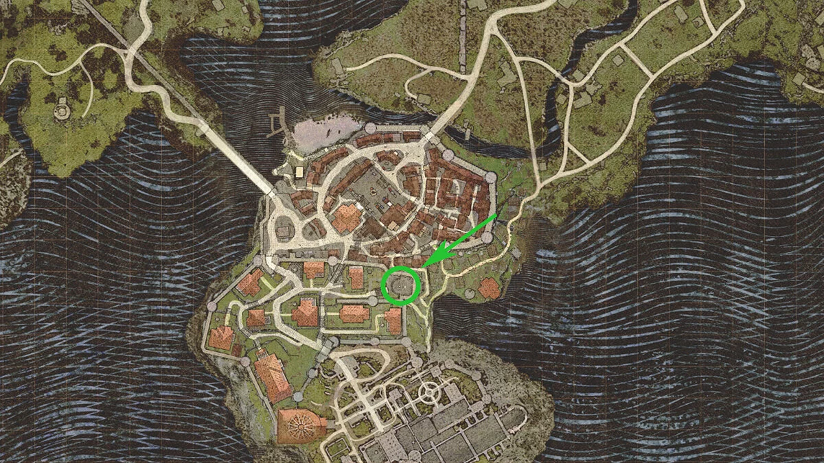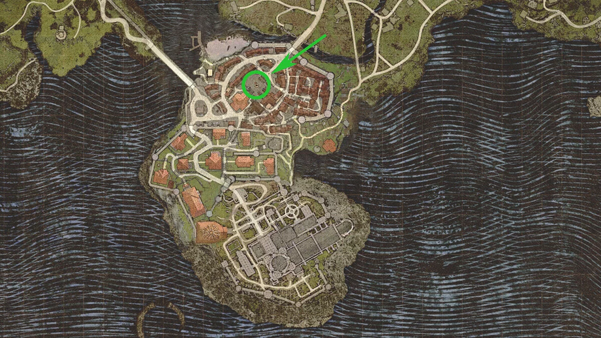 После фонтана двигайтесь на восток, пока не дойдёте до открытой площади. Поднимитесь по каменным ступенькам, чтобы увидеть жетон на решётке под ногами.