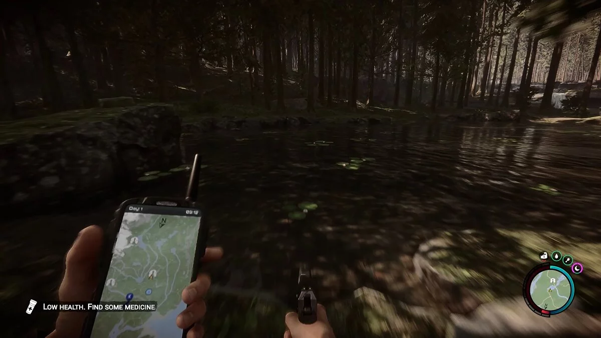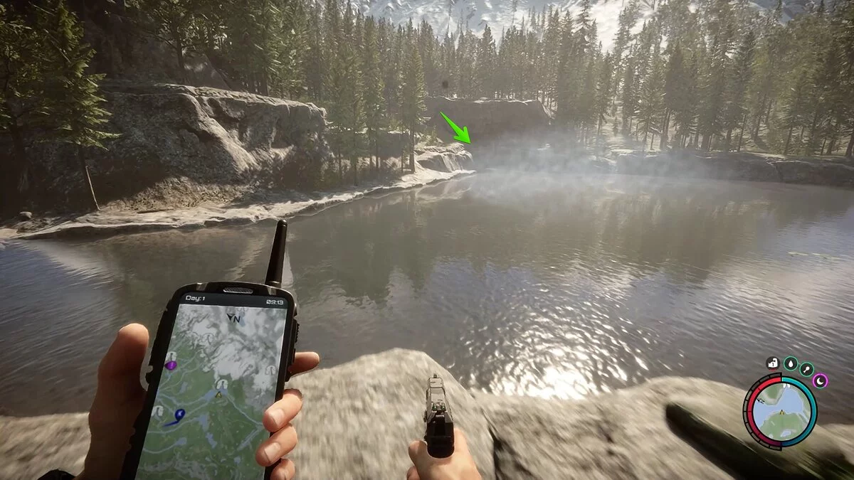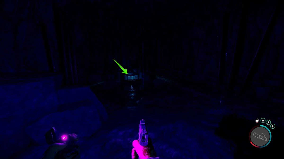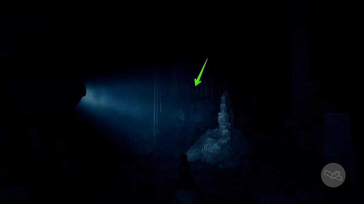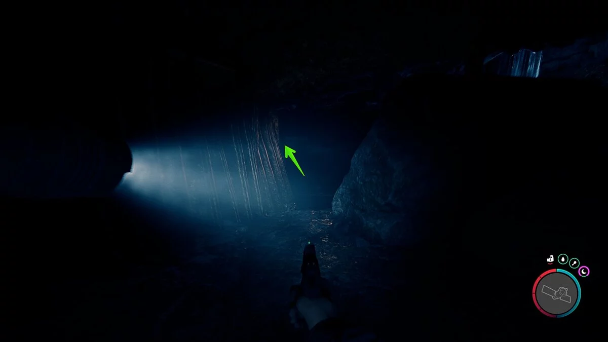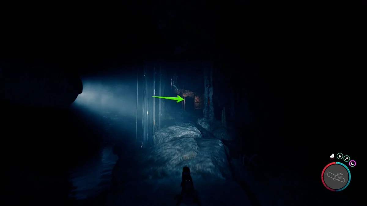 Спрыгнув вниз, основной путь к выходу лежит через туннель слева, а чтобы добраться до артефакта, нужно спрыгнуть к воде с обрыва справа. Но не спешите делать это: осмотритесь и заберите ещё множество полезных предметов, таких как крест и ресурсы для крафта. Здесь же можете отыскать документ рядом с телом одного из рабочих.