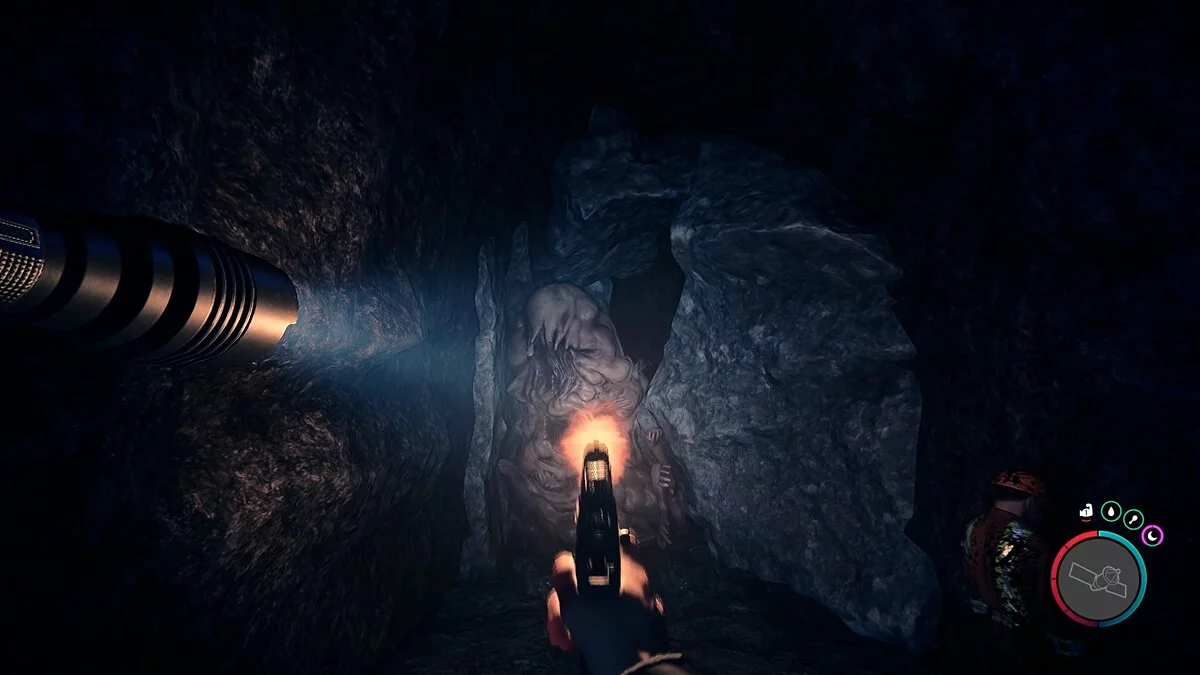 Однако на этом путешествие не закончится. Выбраться точно также не выйдет: путь наверх заблокирован. Придётся идти по единственному туннелю и разобраться с огромным монстром, застрявшим между скалами. Если вы уже отыскали несколько бутылок водки или гранату, можете соорудить коктейль Молотова или швырнуть осколочную для экономии патронов.