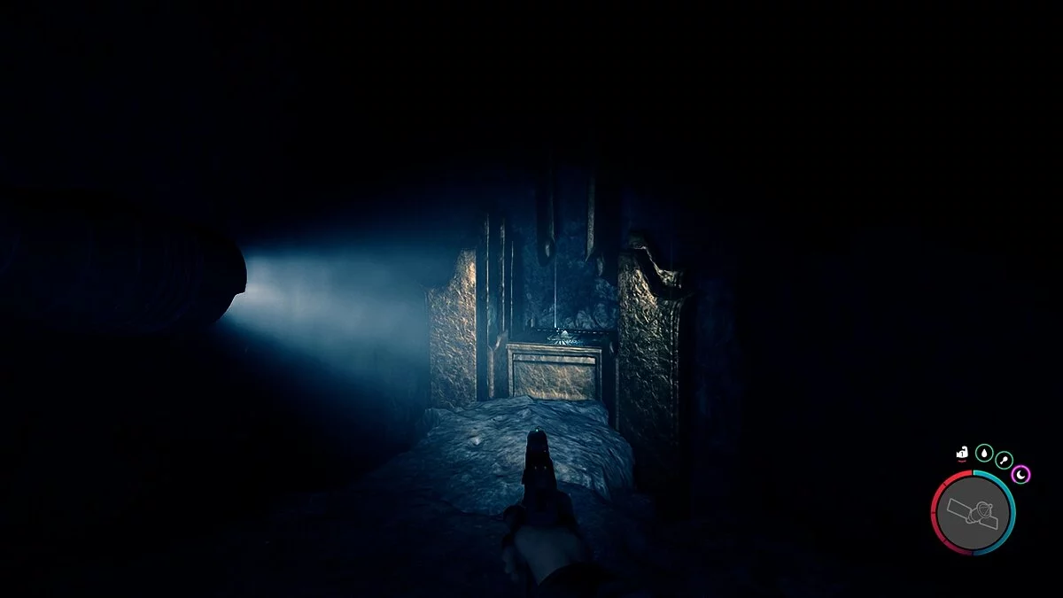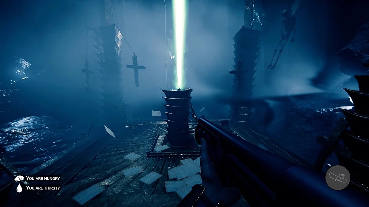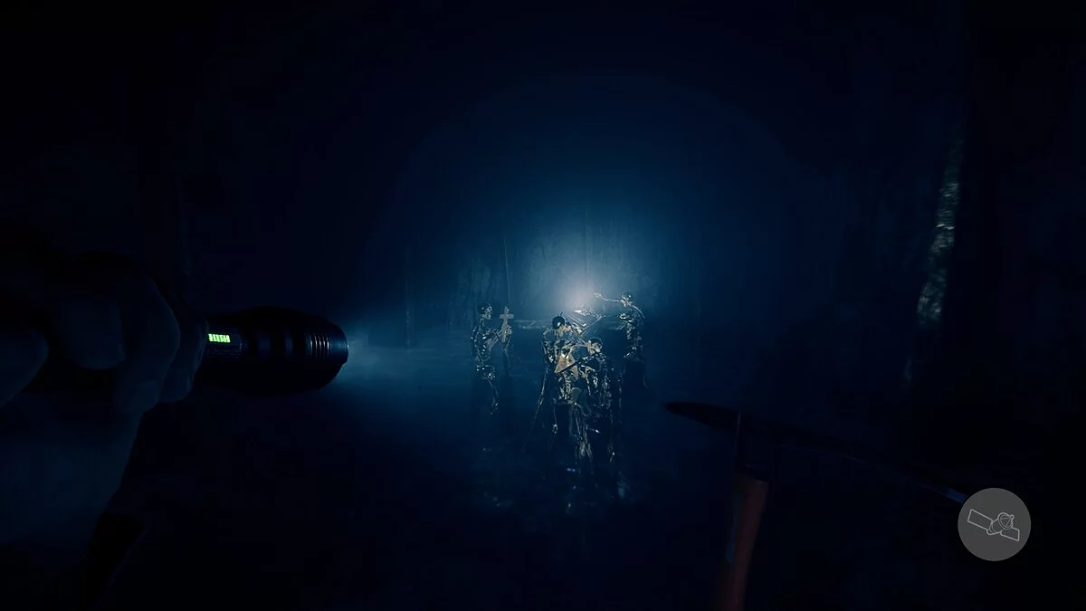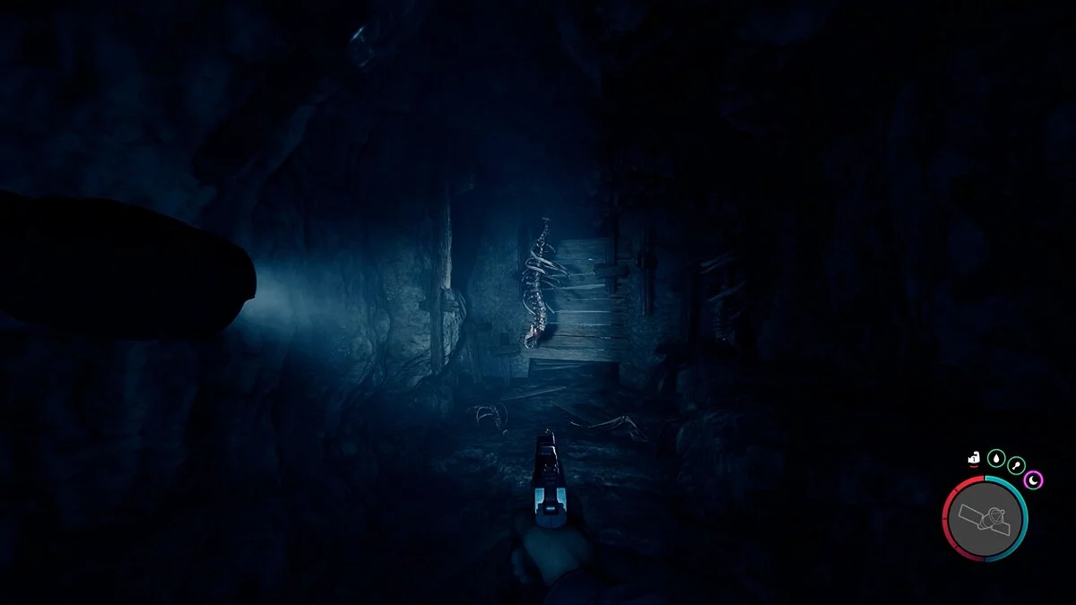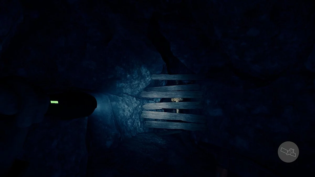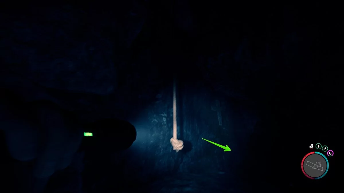 Сверните налево и избавьтесь от досок, преграждающих путь. Перед ними вы ещё заметите подвешенные к потолку кресты — визитная карточка местных культистов. Вы попадёте в небольшую комнату с заколоченным лазом. Уберите доски на земле и спускайтесь ещё ниже при помощи верёвки.