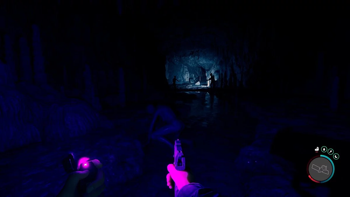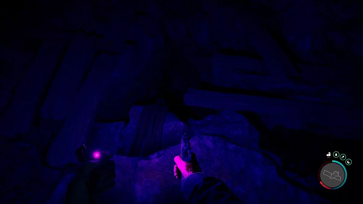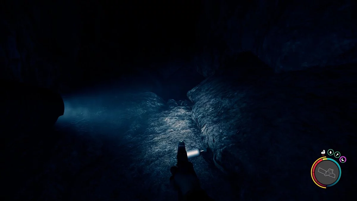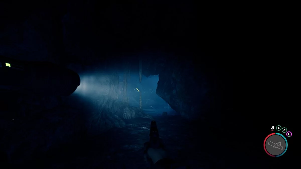 Начать поиск осколков лучше всего с пещеры, в которой вы можете отыскать акваланг (rebreather) и электрошокер. Несмотря на то что буквально в каждой пещере, которую вам предстоит исследовать, есть враги, их совершенно необязательно убивать. Чаще всего они находятся в просторных штольнях, поэтому можете просто не подставляться и пробегать мимо. Однако предварительно мы всё равно рекомендуем посетить два из трёх мест маячков, отмеченных фиолетовыми маркерами на карте. В одном вы найдёте пистолет, а во втором фонарь.