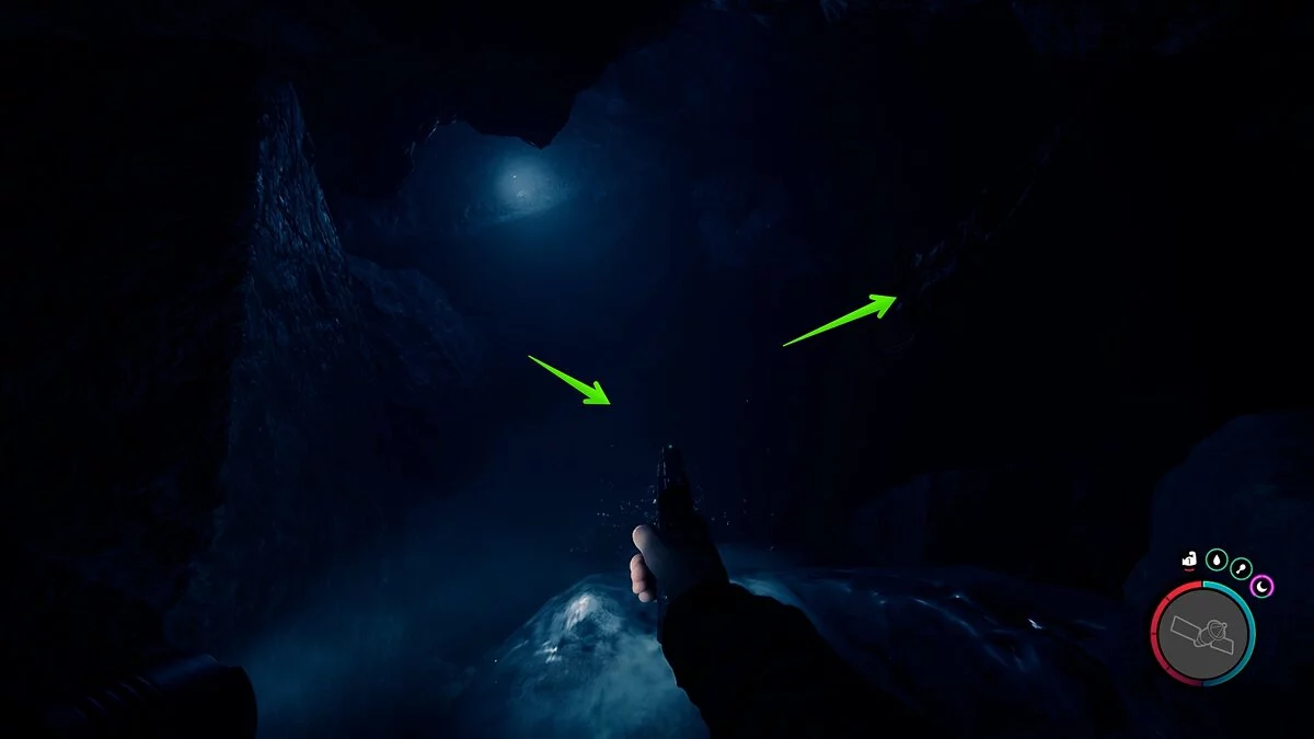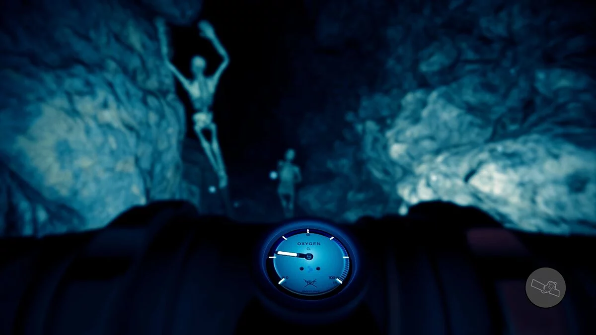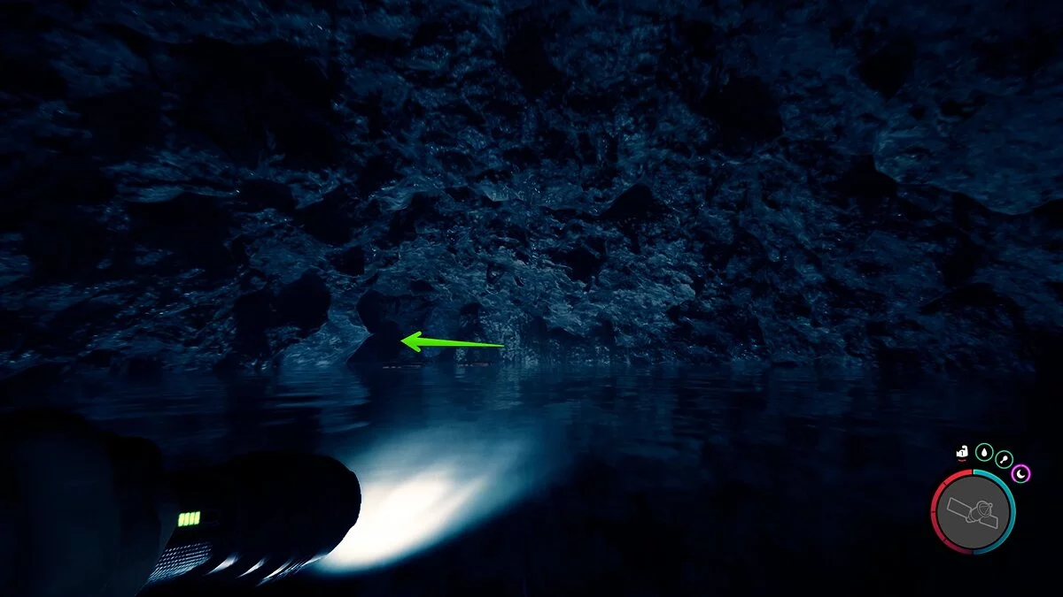 Снова бегите назад до развилки с фонарём и теперь поверните налево. Так вы окажетесь у воды, где найдёте акваланг. Можете попробовать его прямо сейчас: ныряйте под воду и плывите по единственному проходу, чтобы выбраться неподалёку от входа в пещеру.