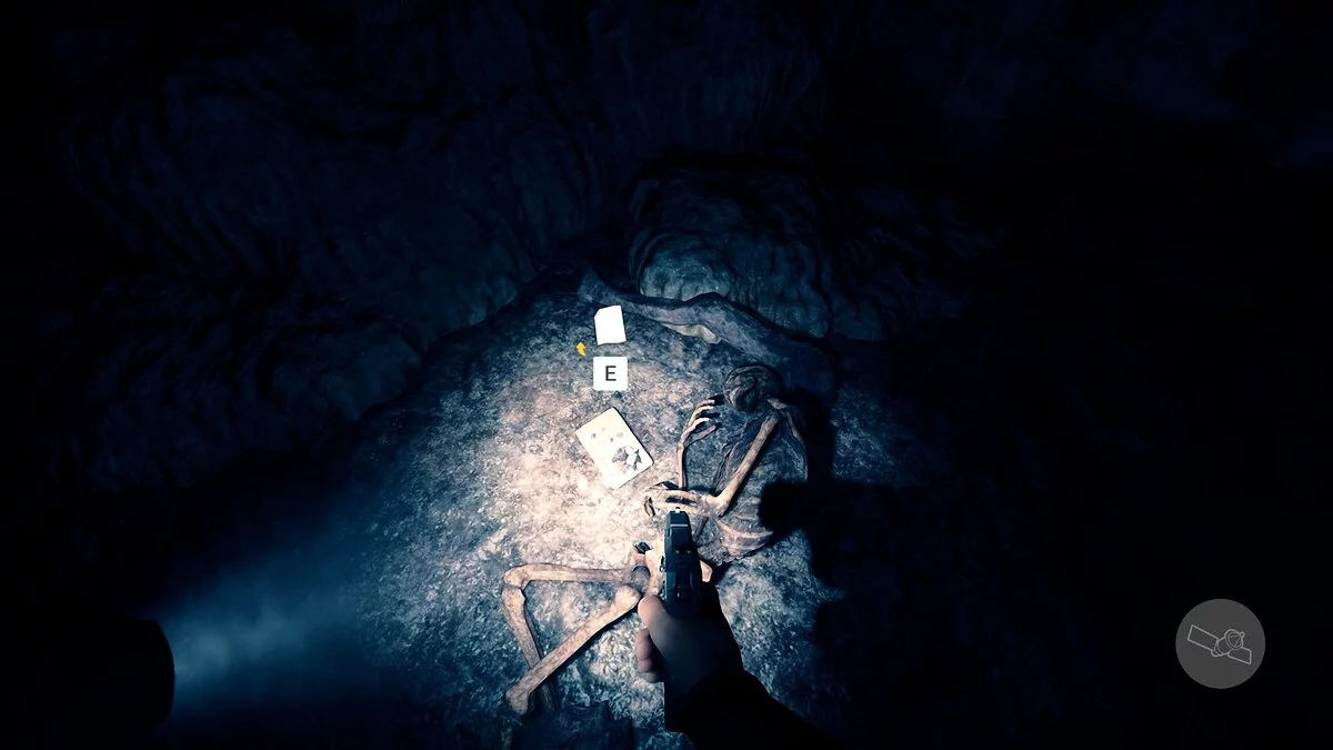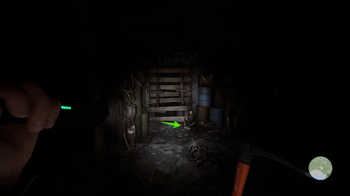 Минуйте штольню с подвешенными скелетами и разберитесь с ещё одним заблокированным проходом из досок. На них будет набит импровизированный крест. Здесь поверните налево и прыгайте в небольшой проём между камней. В тупике на земле будет лежать предмет поисков.