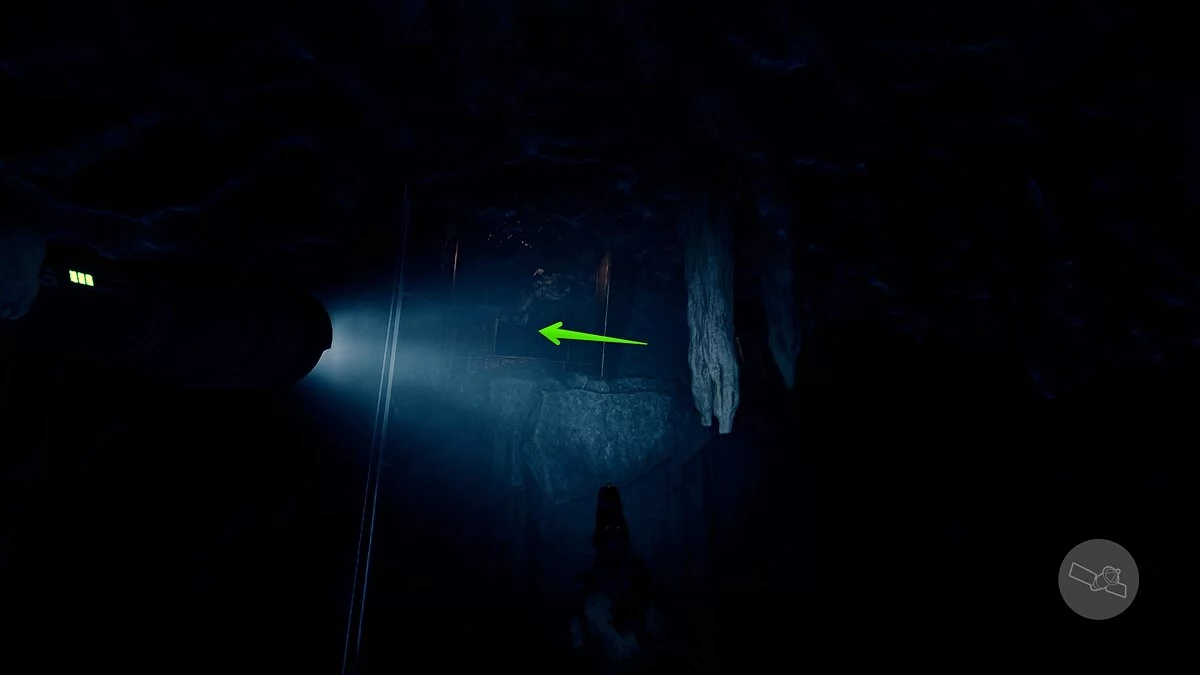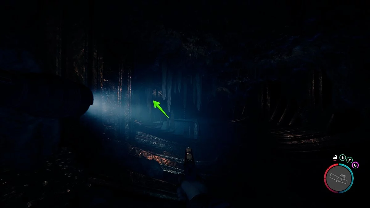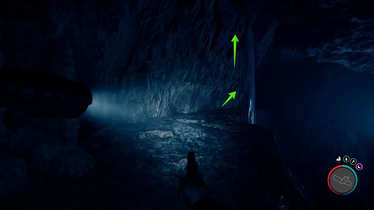 Дальше путь линейный, но на нём вы повстречаете множество сильных врагов. Бегите до конца локации, по пути собирая лут, а также изучив записку рядом с телом рабочего. В конце тропы, когда коридор сузится, на развилке поверните направо и пролезайте под камнем. Здесь ещё будет множество мелких новорожденных монстров. Пройдя через штольню с водой, идите на возвышенность к обрыву. Рядом с трупом в кейсе будет лежать верёвочный пистолет.