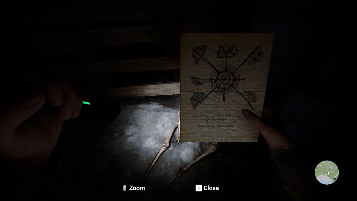 Спуститесь по лестнице ниже. Вы окажетесь в небольшом коридоре. Справа есть комната со скелетами, но она пустая. Осмотрите труп справа от заколоченного прохода и заберите записку, в которой описано, как собрать артефакт.