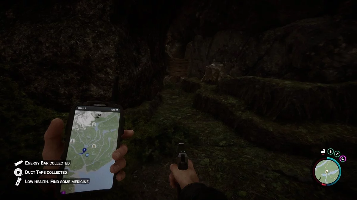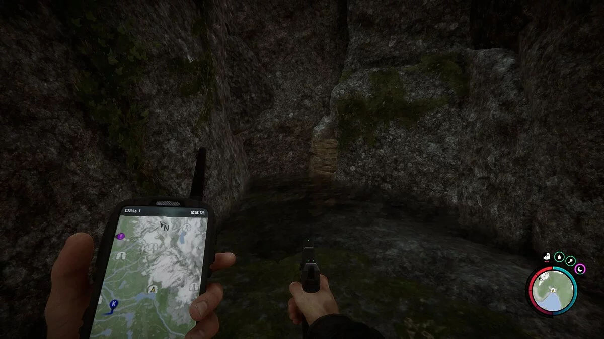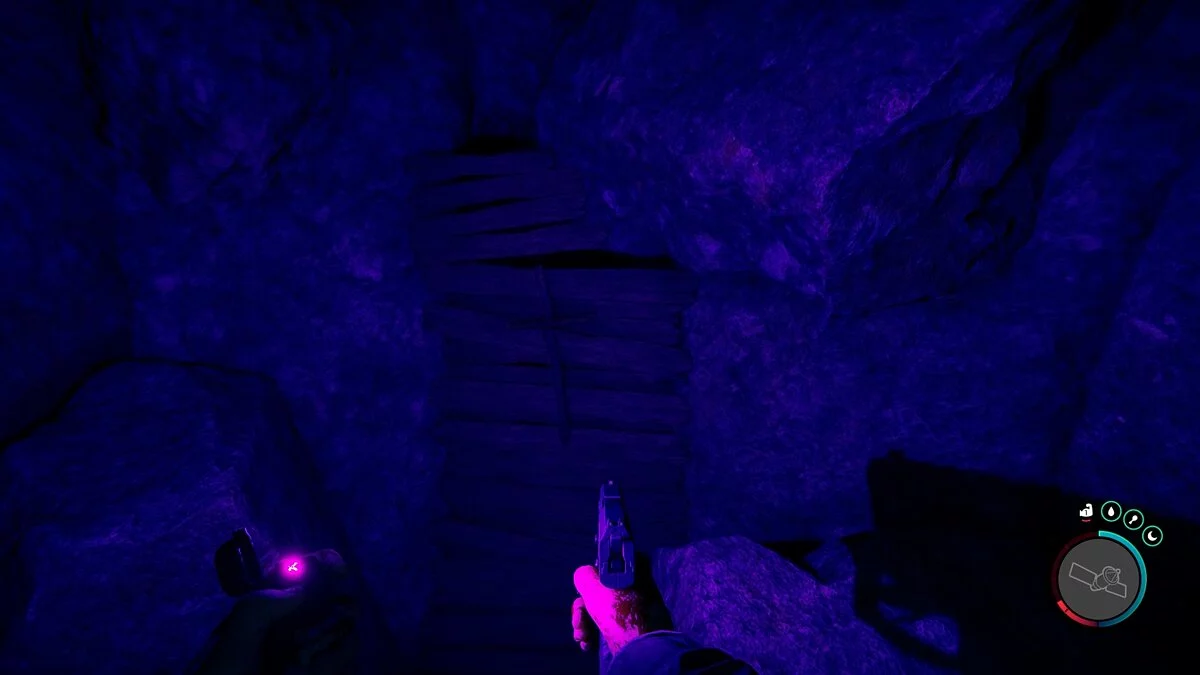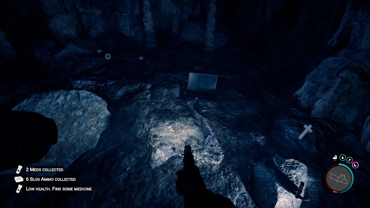 Прямо у входа осмотритесь и отыщите ценный лут: часы, тряпки, свежее мясо и консервы. Все предметы раскиданы вокруг единственной здесь лампы. Бегите по единственному туннелю и спрыгивайте в просторную штольню со множеством врагов. Убивать их или нет — решайте самостоятельно, но чтобы выбраться, придётся всё же разобраться хотя бы с одним толстяком, застрявшем между скал.