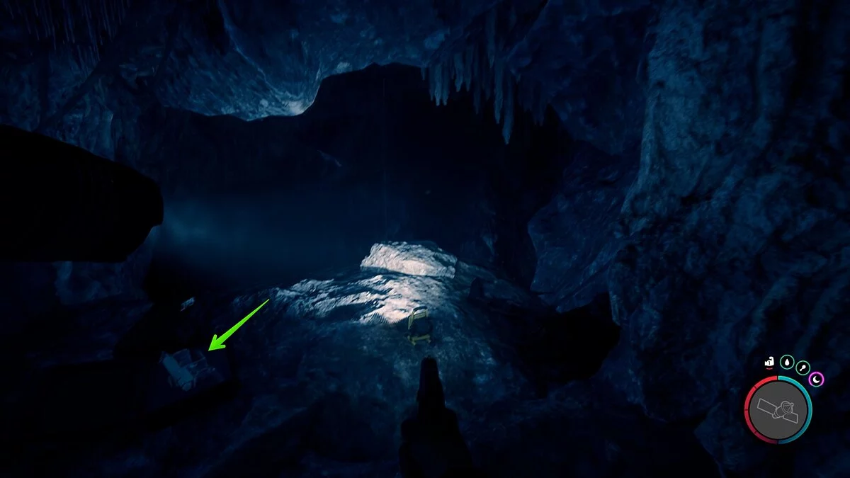 Идите по узкому проходу, затем пригнитесь и проползите под камнями. Если пойти влево, то можно найти несколько запертых ящиков с лутом. Если пройдёте прямо, окажетесь в туннеле с крестами, откуда можно выйти к штольне с артефактом.