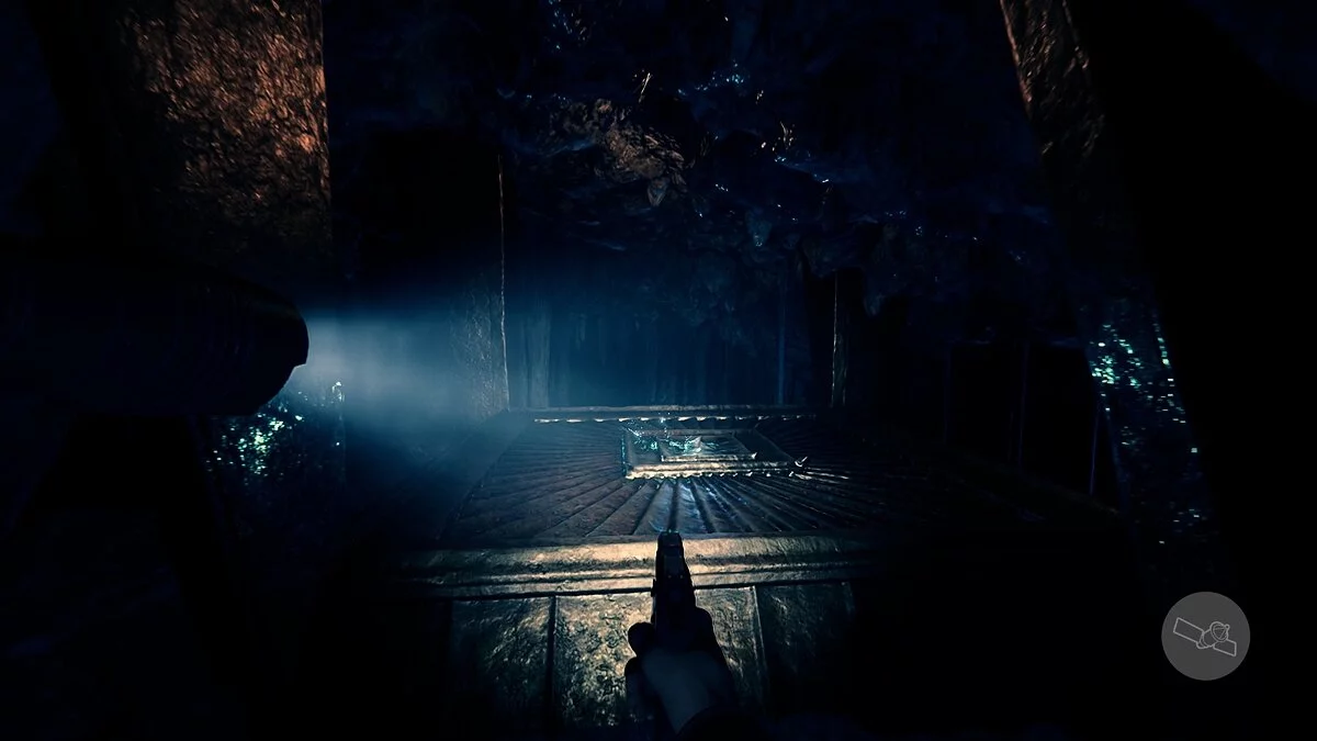 Разбейте доски и используйте канат, чтобы спуститься. Если выбраться из воды, можно отыскать два деревянных запертых ящика с лутом. Затем пройдите по уступу слева и разблокируйте забаррикадированный проход. Далее будет крутой спуск вниз, а после него ещё один заблокированный туннель. Позади досок вы можете наблюдать золотой крест.