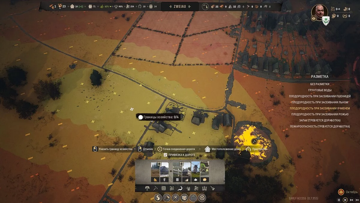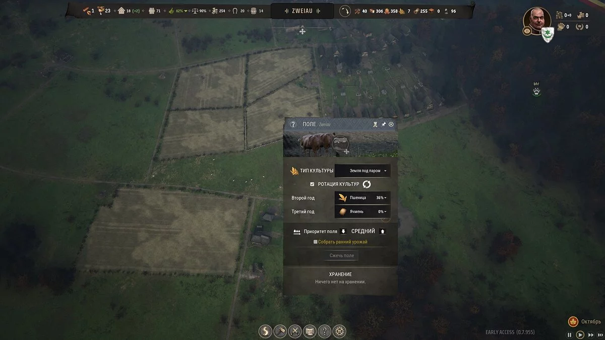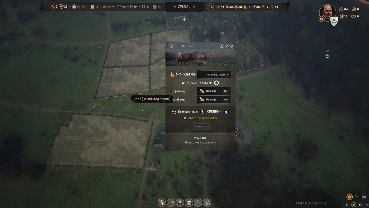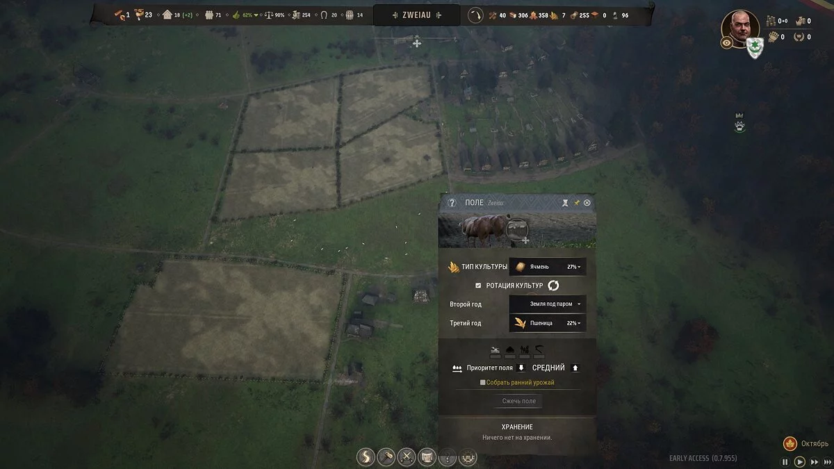 В Manor Lords есть учет усталости земли от постоянного выращивания одной и той же культуры. И подходящее место не гарантия результата, ведь снимать отличный урожай ячменя на протяжении многих лет не получится. Придется оставлять поле «под паром» для того, чтобы земля «восстановила свои силы», или засаживать другой культурой.
