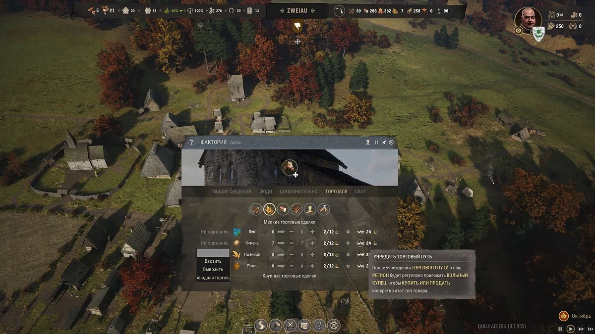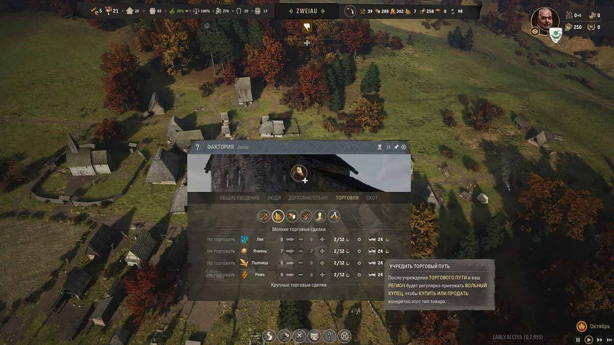 Продажа или покупка эля требует установления торгового маршрута — придется потратить богатство региона, но только так путешествующий торговец начнет посещать вашу факторию.