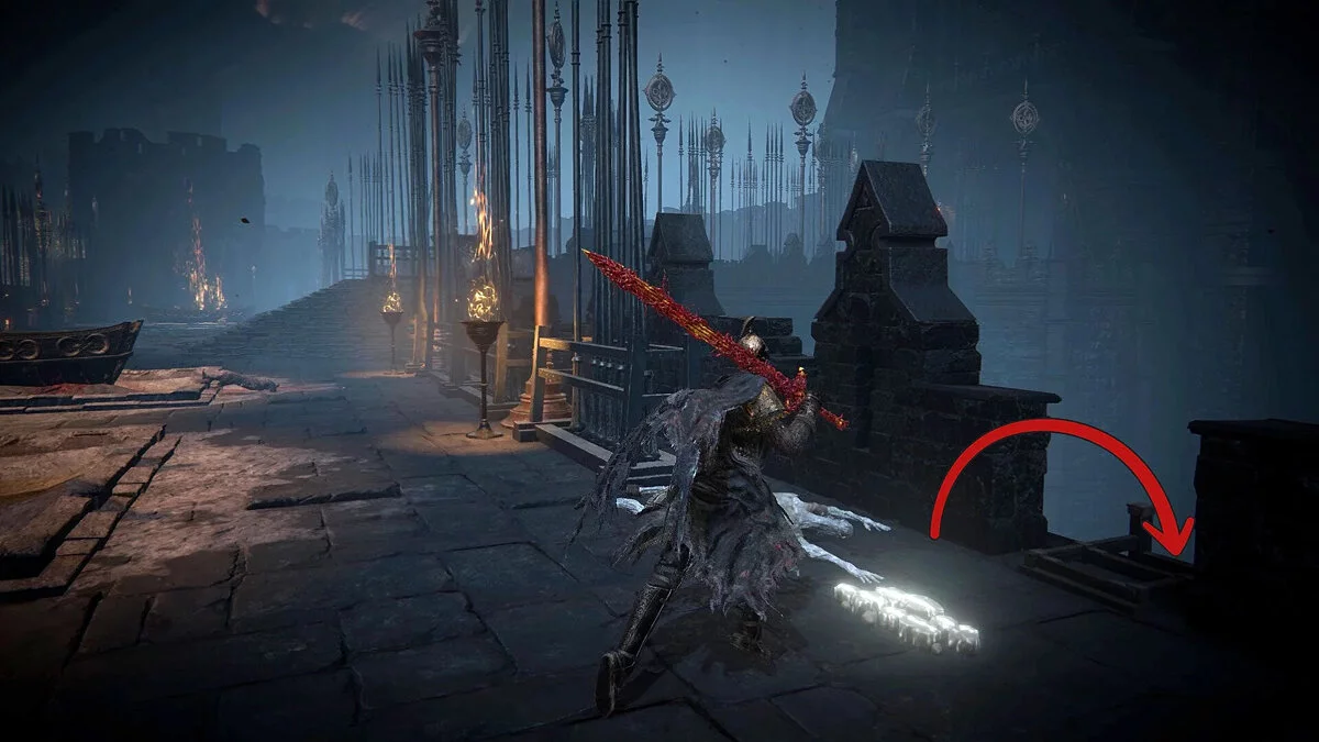 Однако мост не сломан — он невидим. Вы можете использовать такие предметы, как радужные камни или заклинания, для проверки или даже искать знаки других игроков. Пока вы будете следовать прямо от сломанного моста к круглой башне, вы не свалитесь вниз.
