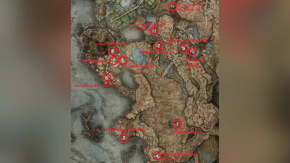 - Талисман в форме расколотого камня (Shattered Stone Talisman): Находится в руинах Муурт, Лежит у края крыши, к которой можно пройти через арочный проём, в затопленном здании у места благодати руин Муурт.