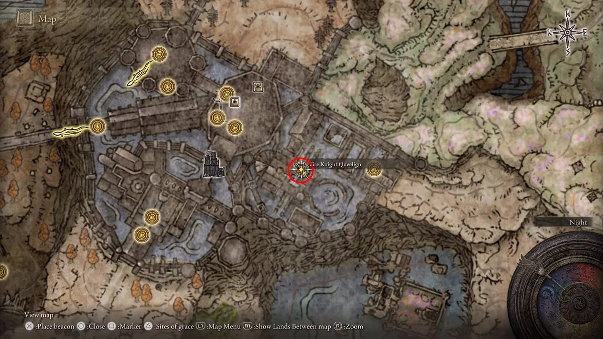 Внутри Молитвенной комнаты вы найдете Рыцаря Огня Квилайна (Fire Knight Queelign), свернувшегося клубком на земле и отчаянно молящегося Марике (Marika). Он будет игнорировать вас, когда вы общаетесь с ним, продолжая молиться.