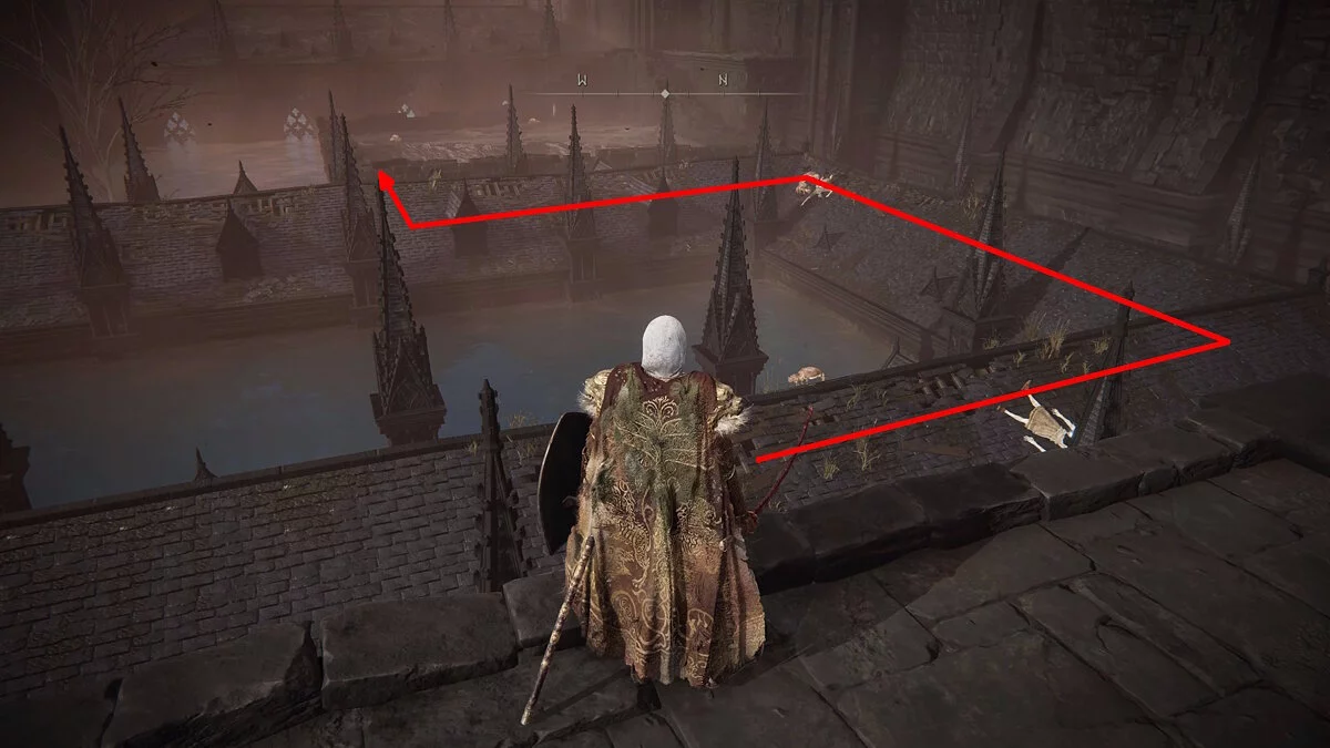 Двигайтесь по северо-восточной стороне этого здания, а затем спуститесь в пропасть. Здесь есть туннель, ведущий к лестнице — придется подняться по этой конструкции.
