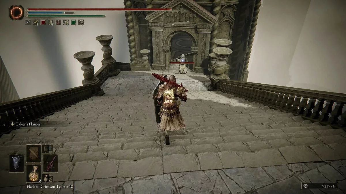 Продолжайте спускаться по новой лестнице через небольшую комнату, полную инквизиторов, и направляйтесь на юго-запад к последнему опасному противнику — Божественному воину-зверю (Divine Beast Warrior). Остерегайтесь его атак молнией и побеждайте его осторожными ударами.