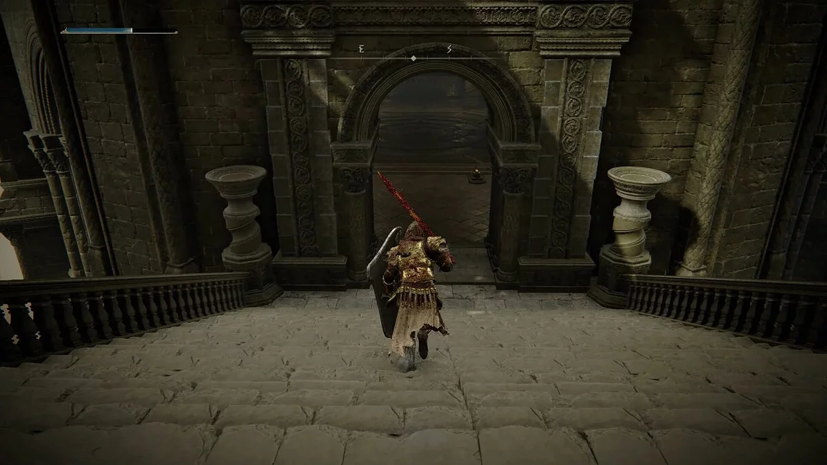Как только вы достигнете конца арок, осторожно обойдите угол, чтобы найти ближайшую башню на юге, подождите выступающих горгулий и спрыгните вниз, чтобы приземлиться на нижнем выступе. Отсюда вы можете посмотреть на юго-восток и увидеть сломанную лестницу, ведущую к большому двору со статуей — здесь вы найдете фрагмент Скадутри (Scadutree Fragment), который вам обязательно стоит подобрать по пути. Спрыгните на лестницу и идите на площадку, где дорога расходится.