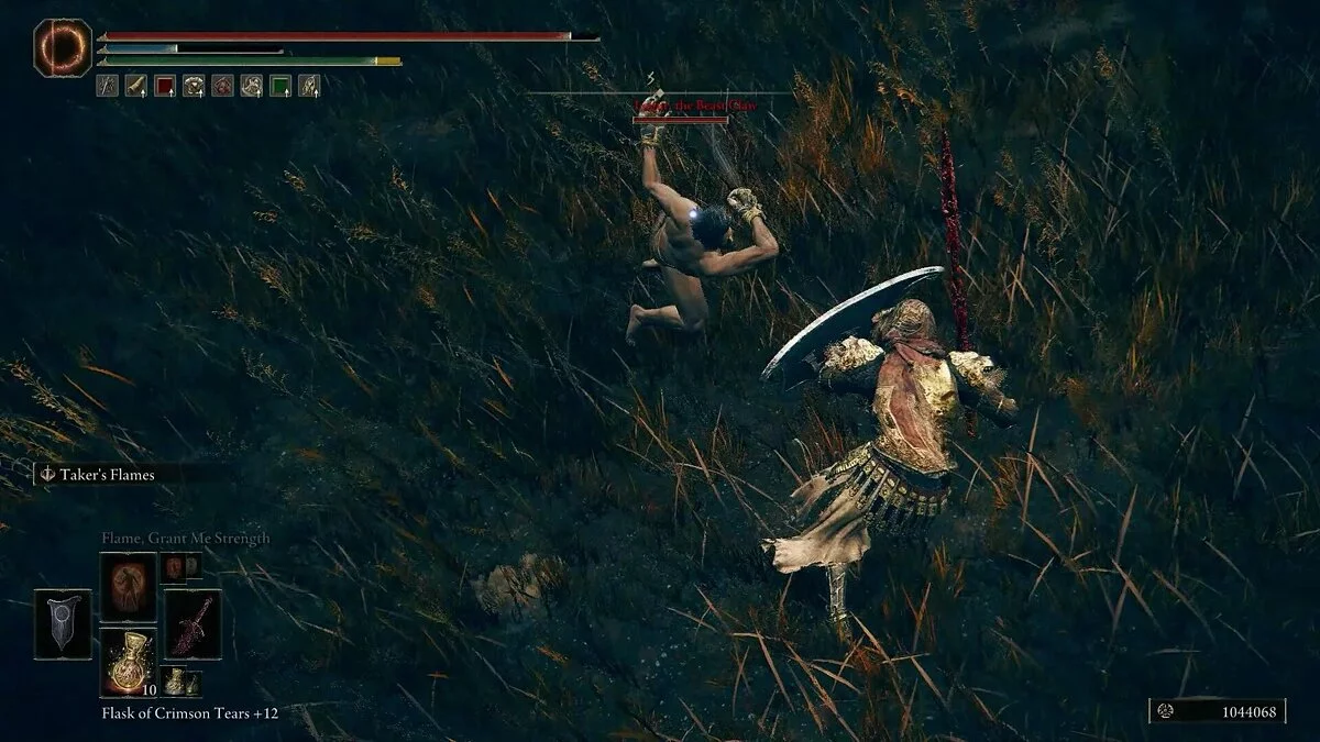 Этот огромный босс ничем не отличается от прошлых противников. Он кусается, делает захваты, крутит головой и заставляет игроков уворачиваться до истощения выносливости. Из-за того, что босс очень больших размеров, а арена для битвы довольно крохотная, вам предстоит изрядно попотеть, прежде чем одержать победу. У бегемота не шибко разнообразный диапазон атак, но двух точечных попаданий хватит, чтобы отправить вашего героя в могилу. И никакие семена древа вас не спасут. Большинство его атак — это одиночные удары. Всегда дожидайтесь его большого удара и следите за таймингами.