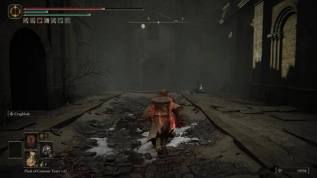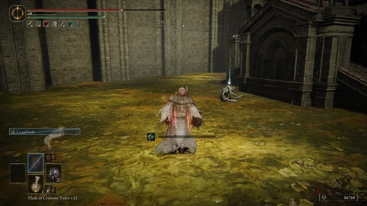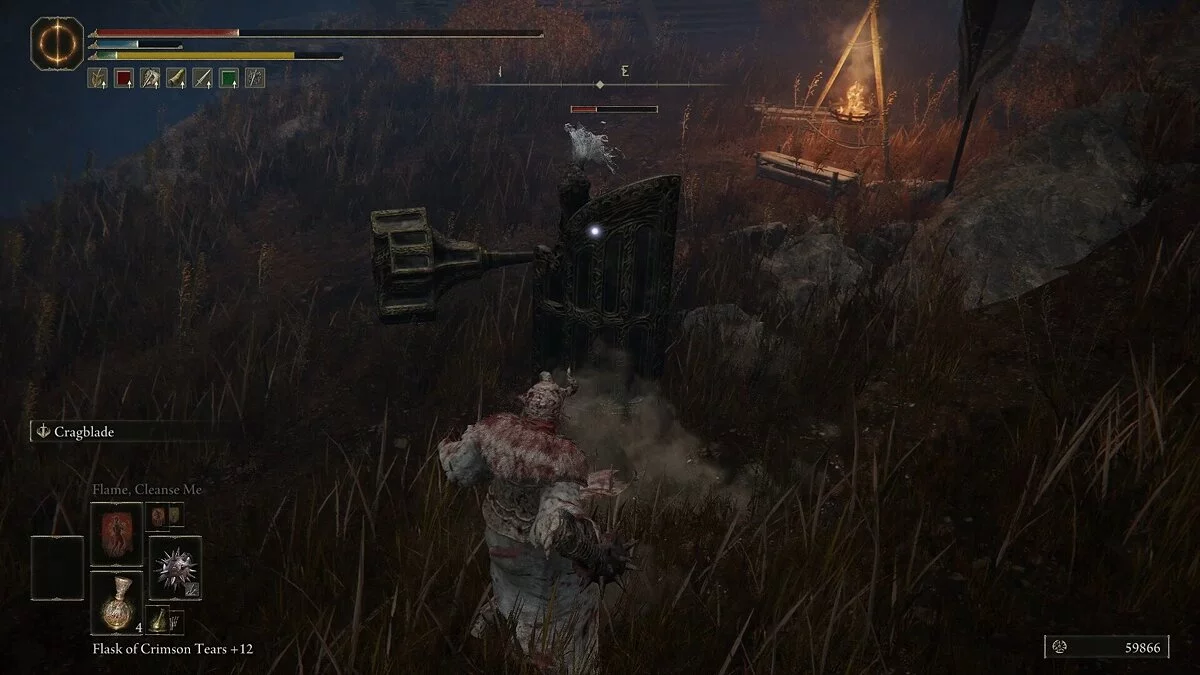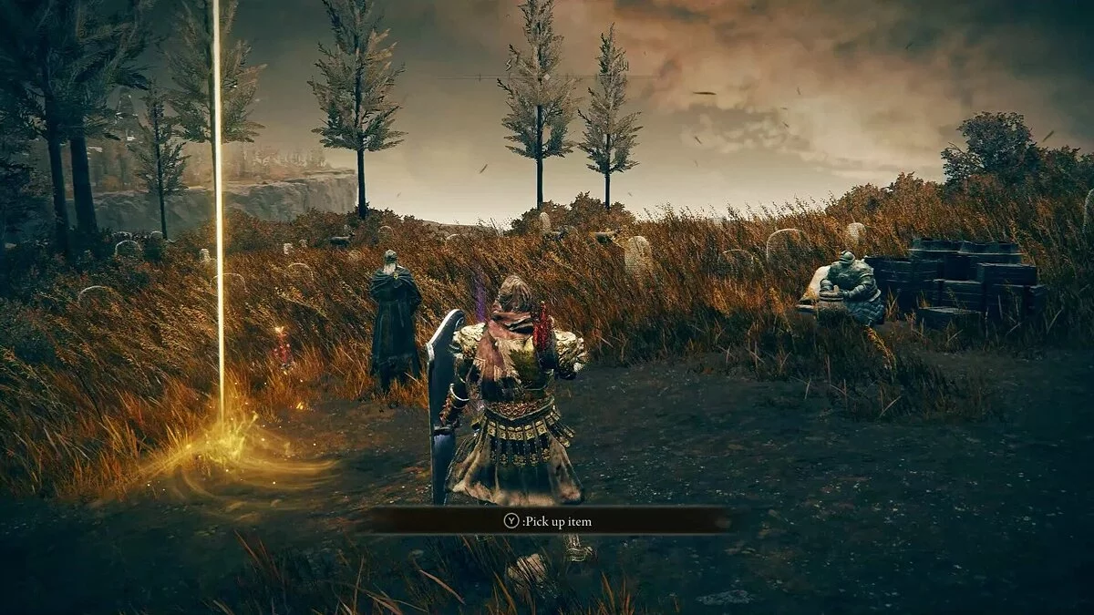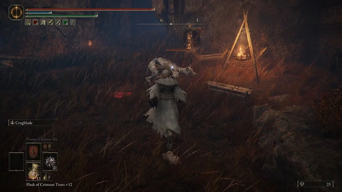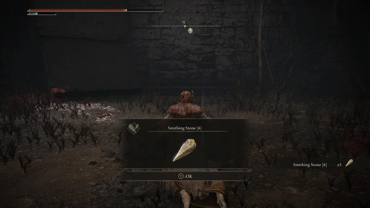 Убив рыцаря, вы получите Эмблему Священного похода, которая повышает силу атаки после победы над врагом. Она даст хорошую прибавку к урону после убийства мелких теневых противников. Обыщите область и соберите предметы: растения (Dewgem), Черных огнянок и Пепел войны — Крик скорби. В левом углу можно собрать камни и стрелы.