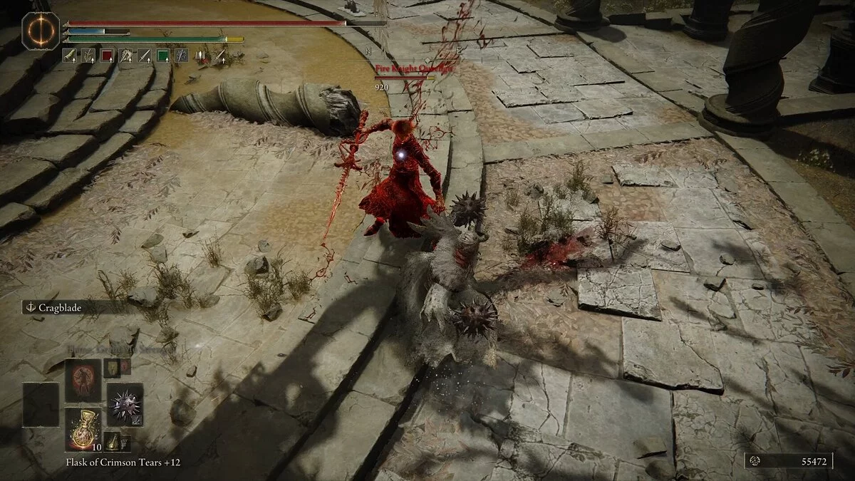 Поднимайтесь к воротам и пройдите через небольшую дверь справа. Она приведет вас к длинному мосту, который даст вам возможность добраться до Древних руин Рауха. Если вы помните текст с записки Леду, то нам нужно исследовать это место, чтобы сжечь дерево. Садитесь на Торрента и скачите вперед. По пути вы столкнетесь с летучими мышами, а также предметами: Плод рады, Печень монстра, Кровь чудовища, Зелье Призывающего пальца, Тонкие звериные кости. Когда вы приблизитесь к концу моста, сверху начнут падать пламенные сгустки. Вы можете укрыться от них за колоннами. Пламя исходит от особого рыцаря Огня. Скачите к нему и атакуйте. У этого врага два ножа, которые он использует в комбинациях. Старайтесь держаться от рыцаря подальше до тех пор, пока он не выдохнется. Победив врага, вы получите капюшон Сальзы и заклинание «Огненный дождь». Войдите в комнату, которая была позади босса, и возьмите Кузнечный камень (8). Поднимитесь по ближайшей лестнице, которая ведет к лифту. Он доставит вас прямо к Древним руинам. Активируйте место благодати.
