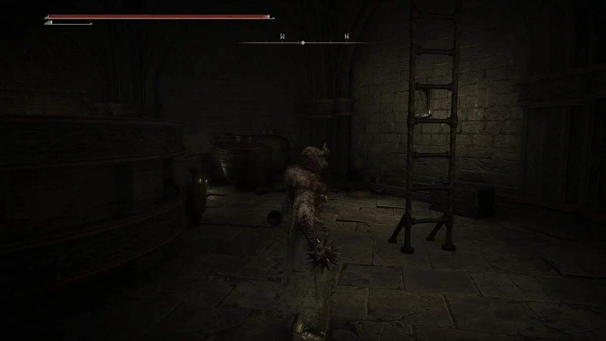 Лестницу охраняют солдат и собака. Эти противники могут быть довольно опасными, особенно когда они усиливаются от своего крика. Следите за их атакой топотом, которая наносит урон по земле. Перекаты вам не помогут. Когда вы увидите приближающийся топот, начните подпрыгивать. Победив солдата и собаку, вы сможете подняться по лестнице. Далее взбирайтесь по лестнице в дальнем углу, чтобы попасть в пристроенную башню. Там вы найдете сундук с легким двуручным мечом.