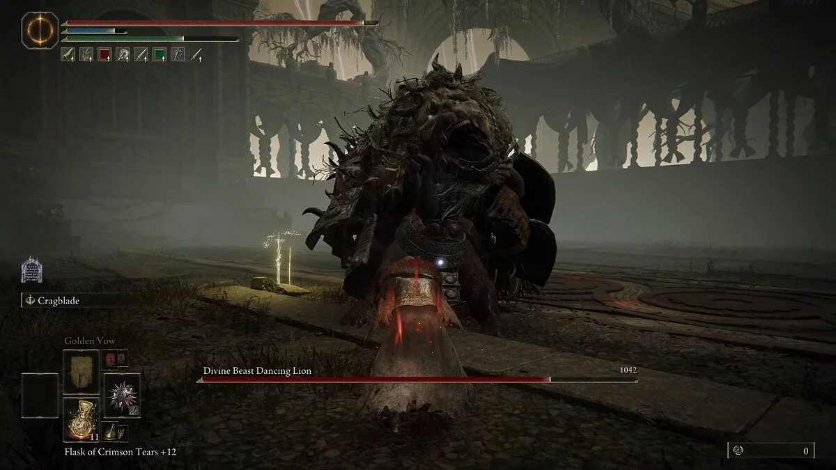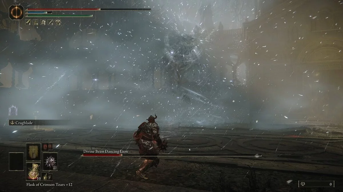 Когда вы отнимете льву треть здоровья, он войдет во вторую фазу. У него появятся элементальные улучшения. Теперь все его атаки будут накладывать дебафф по области. Вам необходимо уклоняться и не пытаться парировать. Первым улучшением будет молния. Она самая опасная. Вокруг босса будут случаться рандомные удары. В этот период старайтесь держаться подальше.