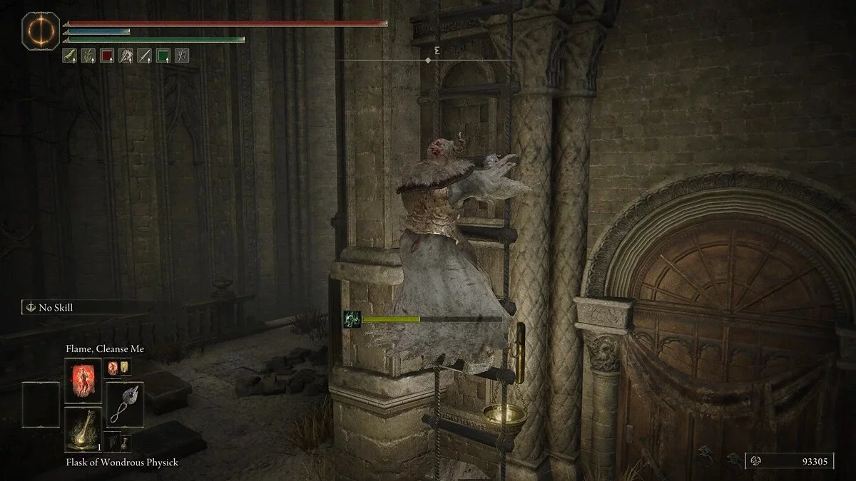 Пройдите мимо площади и поднимитесь по лестнице в башню. Идите направо и возьмите камень с уступа. Затем идите налево от двери и поднимитесь по лестнице. Здесь вы столкнетесь с очень агрессивным врагом — Проклятым клинком. Место благодати находится за этим противником, так что вы можете пробежать мимо и активировать его. После этого вернитесь к врагу и убейте его. Стоит отметить, что проклятый постоянно вращается и не перестает атаковать. Сохраняйте дистанцию и переждите одну из мощных атак, чтобы получить окно для выпада.