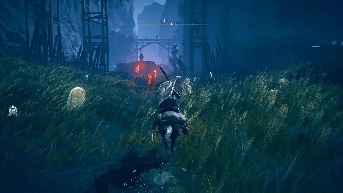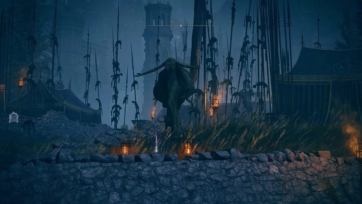 В центре лагеря вы найдете место благодати «Замок Энсис». Оно расположено рядом со статуей Марики, которая держит в руках Благословение Древа Скаду. За мостом находится масштабное подземелье «Замок Энсис». По размеру оно меньше Белурата, но при это не лишено сильного босса, который преграждает путь к остальным частям карты. Прежде чем отправиться внутрь, нам нужно до конца исследовать Равнины Надгробий и прокачать силу персонажа.