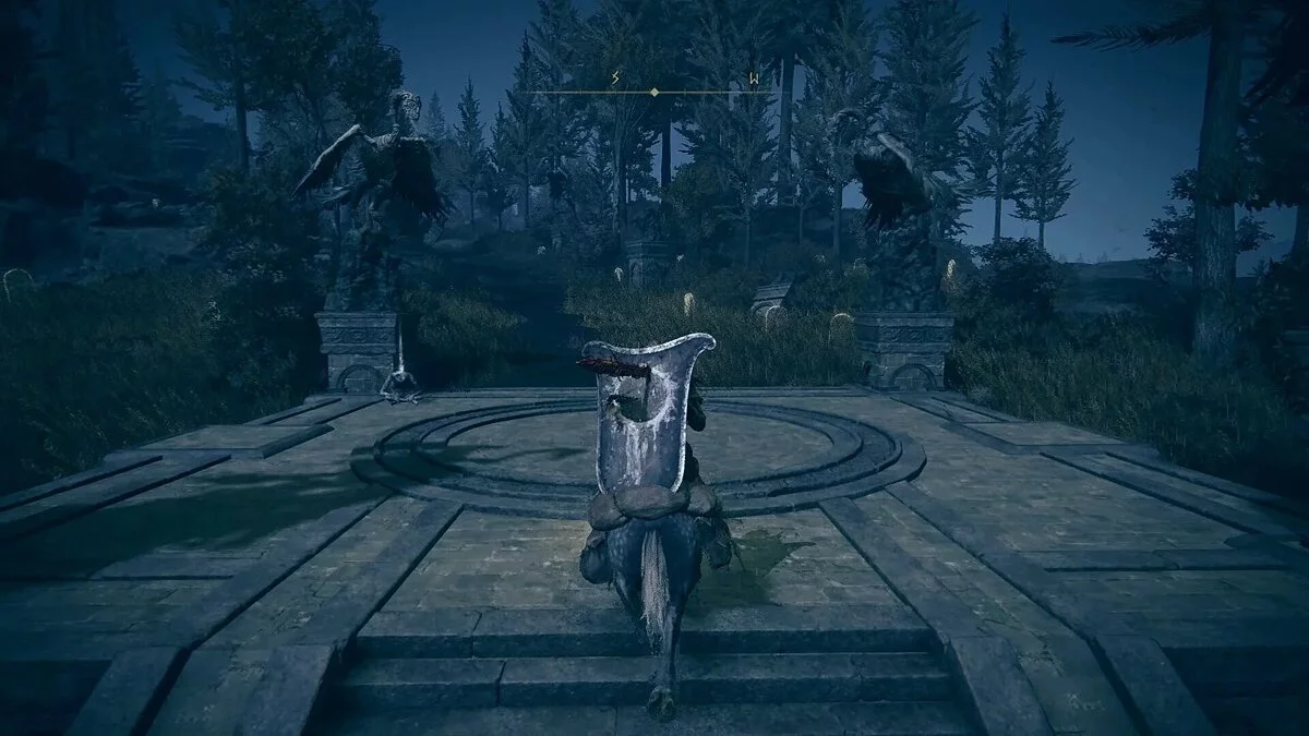 Оказавшись на другой стороне, вы можете свободно пройти к воротам замка. Не забудьте захватить фрагмент Благословения Древа возле статуи справа, а также активировать место благодати рядом с дорогой — Замковый фасад. Победив рыцаря-тролля у подножия, вы попадете в сам замок Энсис.