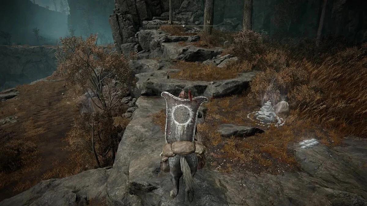 Через арку вы увидите небольшую дорогу, которая ведет к стеле и фрагменту карты. Она стоит рядом Выжженными руинами (Scorched Ruins), которые нужно исследовать, чтобы собрать новые мощные предметы: Огромный треснутый горшок, Кулинарную книгу Великого Владыки (1) (дает возможность изготавливать Огромные треснутые горшки) и Талисман Клинка Милосердия (увеличивает урон после критической атаки).