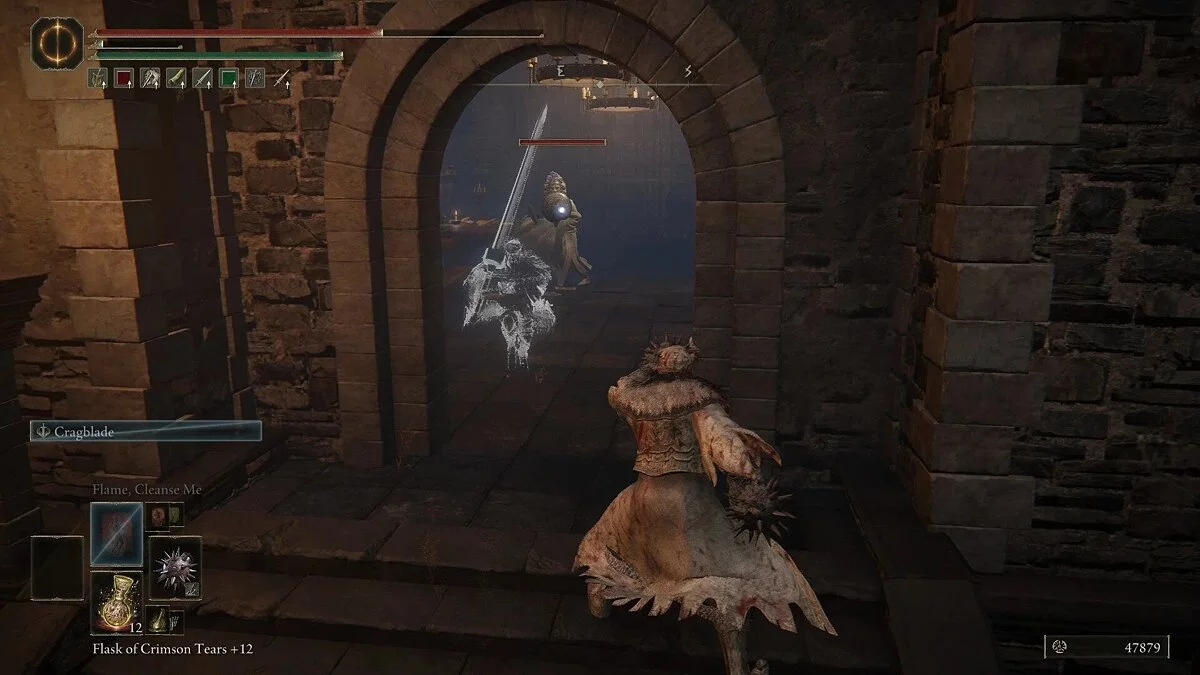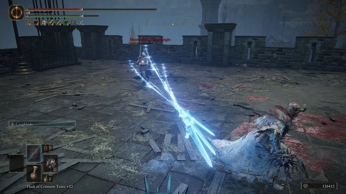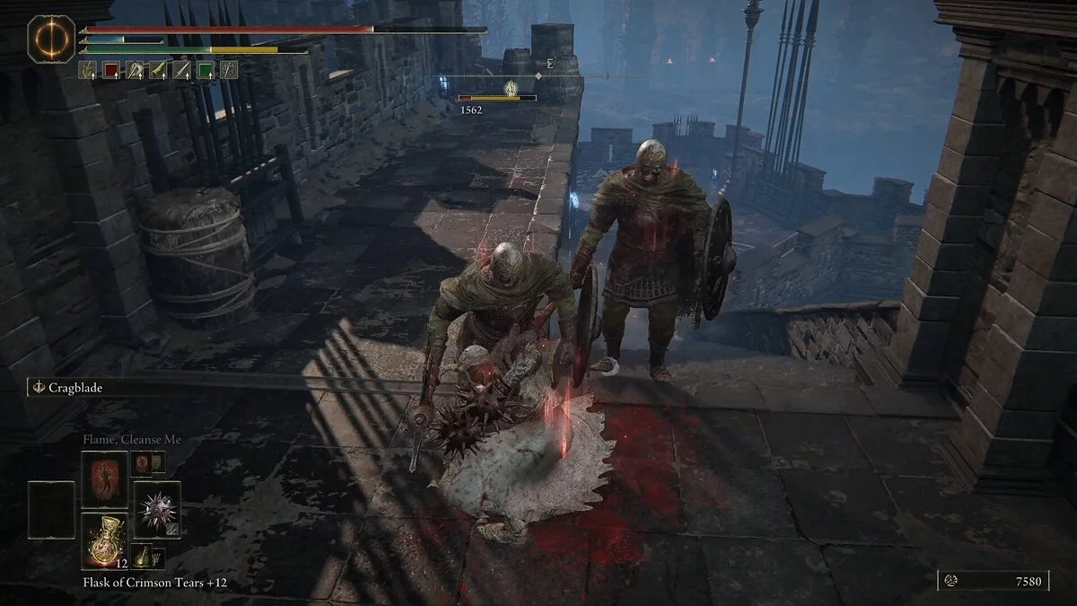 Вы столкнетесь с врагом, который владеет рапирой и арбалетом. Он довольно ловкий и хорошо уклоняется от атак. Загоните его в угол и нанесите комбо-удар. Как только он умрет, вы можете забрать Мрачный кузнечный камень с вершины стены. Спуститесь на землю и вернитесь к первой лестнице. Поднимитесь наверх. Здесь вы столкнетесь с карианским рыцарем. Он владеет двуручным мечом, но не пользуется щитом. Враг может призывать блестящие клинки, которые обеспечивают небольшую защиту. Его атаки наносят огромный урон, но они очень медлительные.