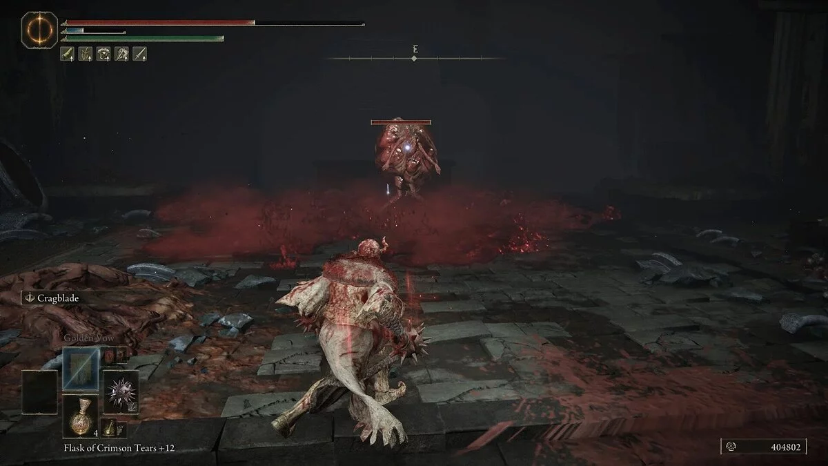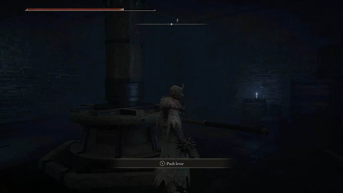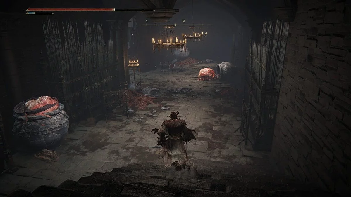 Пройдите в левую дверь, чтобы попасть в большую комнату. Она заполнена маленькими воинами-кувшинами, которые будут отчаянно пытаться схватить вас. К счастью, у них мало здоровья, и они, скорее всего, погибнут от одной заряженной атаки. Слева будет стоять алтарь, а нам будет стоят особый Осужденный, который призывает трясину крови. Эта субстанция будет замедлять вас и наносить урон. Постарайтесь кувырками добраться до врага раньше, чем начнет кастовать магию. Убив врага, вы сможете забрать Ирис Милости, а также подобрать Большой треснувший горшок с кровати. Ирис — важный предмет, который позже можно отдать некоторым ключевым персонажам. Пройдите на другую сторону зала и оттуда в смежную комнату. Победите Осужденных и спуститесь по лестнице. Вас встретят воины-кувшины. Убив их, активируйте место благодати.