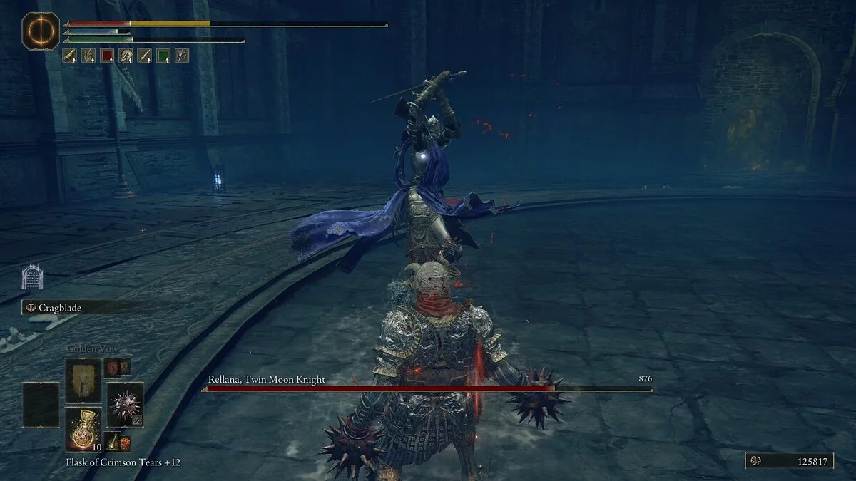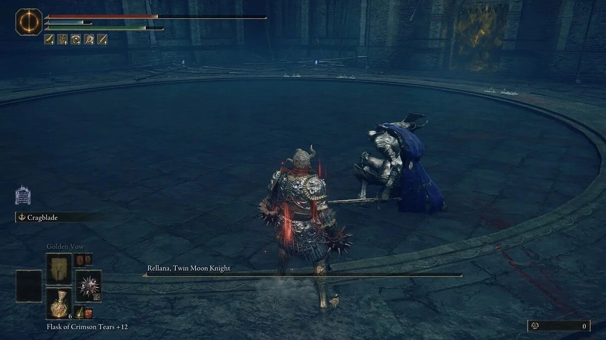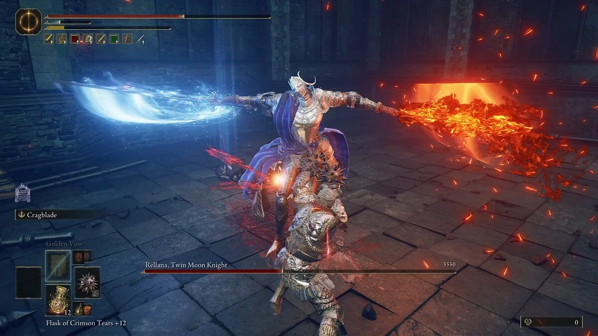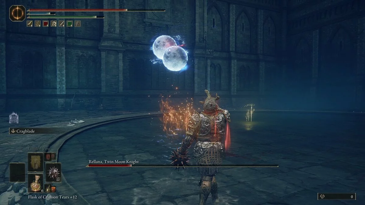 Реллана, Рыцарь Двойной Луны — сильный боец, который пользуется комбинацией из быстрых ударов двойным мечом и магических заклинаний. У босса очень большой радиус атаки, и ее очень сложно избегать. Важнее запомнить ее действия и не пытаться перекатываться. Основная загвоздка заключается в том, что ее комбо часто вводят в заблуждение. Она может закончить их слишком рано или, наоборот, продлить, в зависимости от ситуации. Используйте уклончивую стратегию, маневрируя в пределах радиуса ее атак и выходя за их пределы.