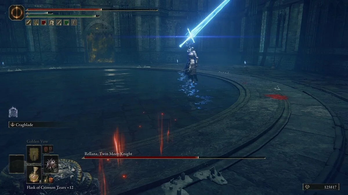 Третья магическая атака Релланы — заряженный луч меча. Если вы увидите, как босс начинает заряжать один из своих мечей, со всех ног бегите на него. Когда она замахнется, магический клинок выстрелит в вас. Уклонившись от магического клинка, вы сможете провести несколько ударов, прежде чем Реллана вернется в стойку. Когда ее здоровье приблизится к 60%, появится новая атака — огромный магический меч. Он медленно заряжается и от него легко уклонится. Как только вы увидите, что босс начал призывать гигантский клинок, сразу начинайте сближение. Когда случится первый взмах, уклонитесь от него перекатом. Следом будет второй горизонтальный взмах, который охватывает всю арену. Уклонитесь перекатом снова, чтобы избежать урона, и затем нанесите Реллане несколько атак.