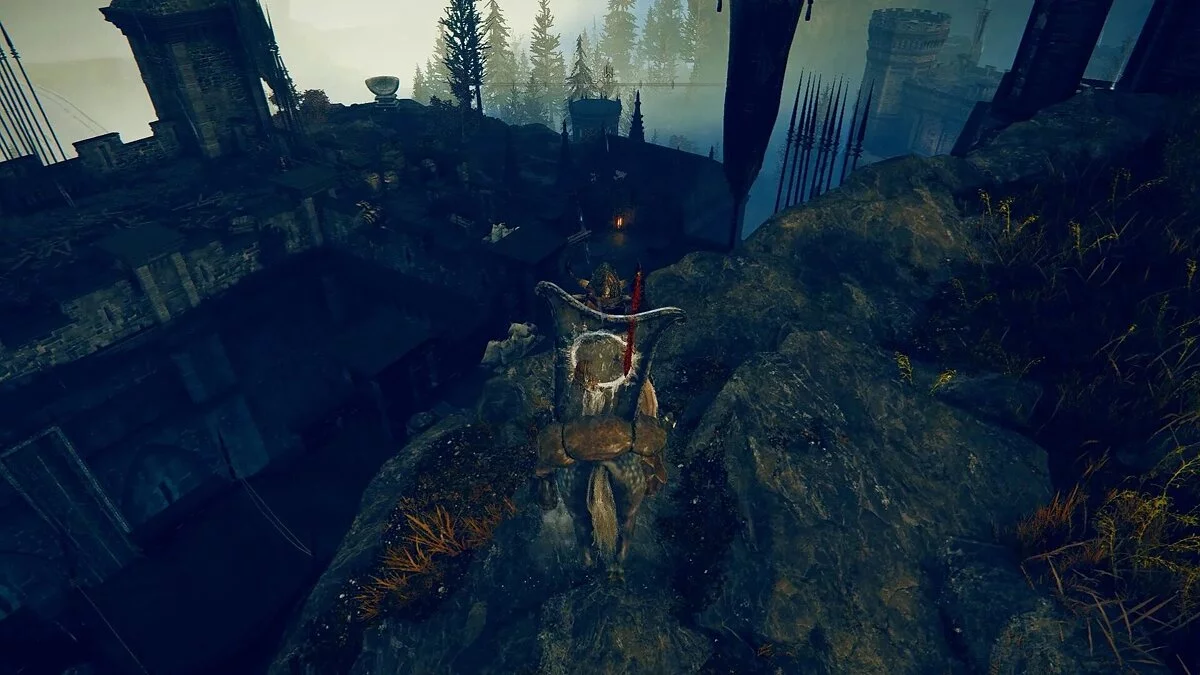 Продолжайте идти вперед. Далее по лестнице вокруг башни. В засаде будет сидеть рыцарь-копейщик. Будьте готовы уклоняться и блокировать его атаки. Внутри башни вы найдете сундук с Ключом Зачарованного Меча. Выходите из комнаты и посмотрите вперед. Вы увидите огромного рыцаря с булавой. Убейте его по уже известной тактике. Если вы не хотите с ним сражаться, просто пробегите мимо и воспользуйтесь лифтом. Наверху будет комната с местом благодати. Выше будет обасть с боссом. Но прежде нам нужно изучить еще одно место. На балконе вы найдете Мрачный кузнечный камень. Спрыгивайте вниз, чтобы попасть на скалу. Аккуратно двигайтесь дальше, чтобы добраться до башни. Входи внутрь. Поднимитесь по лестнице, чтобы попасть на вершину. Вы найдете сундук с пеплом войны. Его можно применить к легким двуручным мечам. Возвращайтесь в Зал Лорда, чтобы приготовиться к битве с боссом.