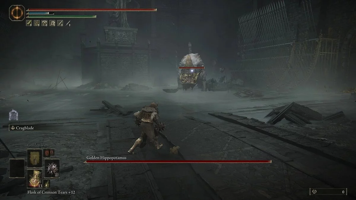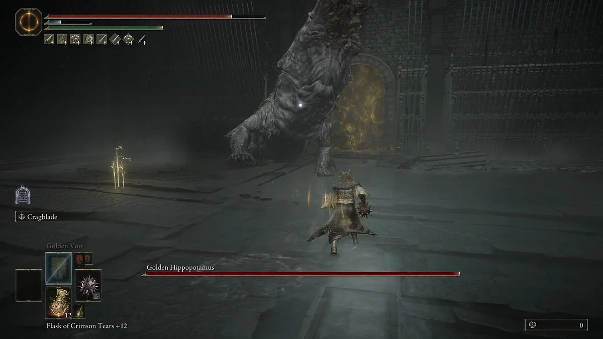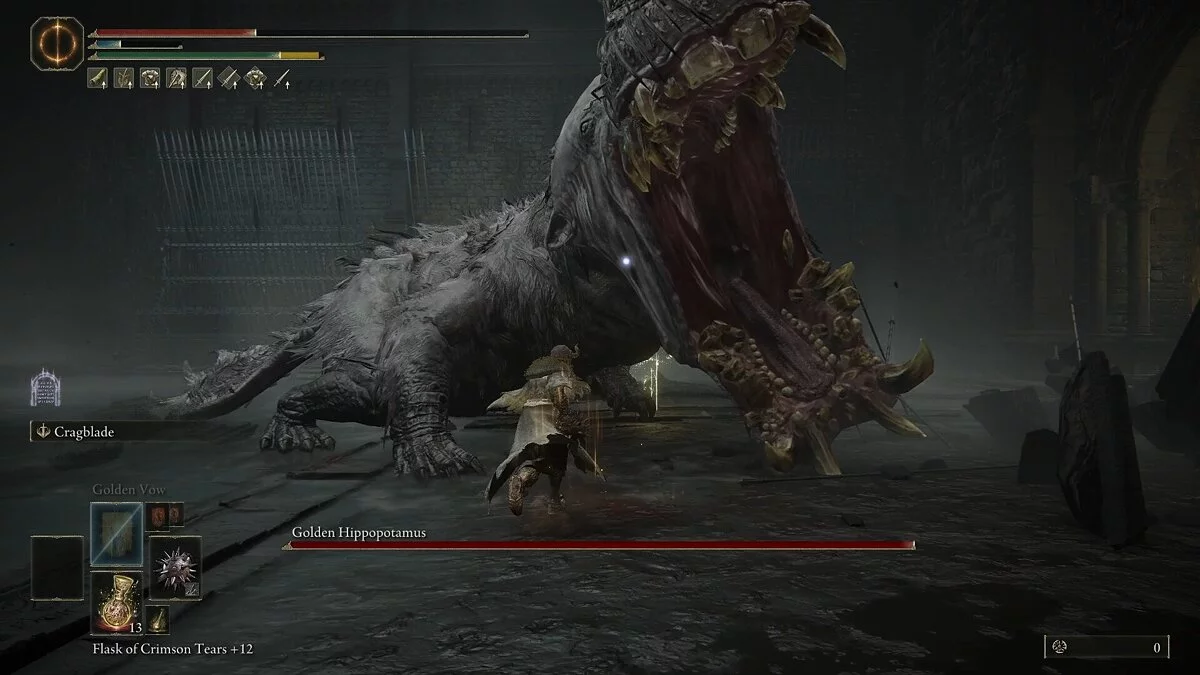 Бегемот почти всегда начинает битву, бросаясь на вас с открытым ртом. Эта приводит к захвату, в ходе которого враг кусает вас несколько раз, нанося большой урон. Сам укус довольно медленный, но имеет большой радиус действия. Босс запросто поймает вас, даже если вы прокатитесь мимо. Старайтесь обходить его и атаковать сбоку, когда рывок подходит к концу. Главное — не жадничайте. После одного сильного удара отступайте.