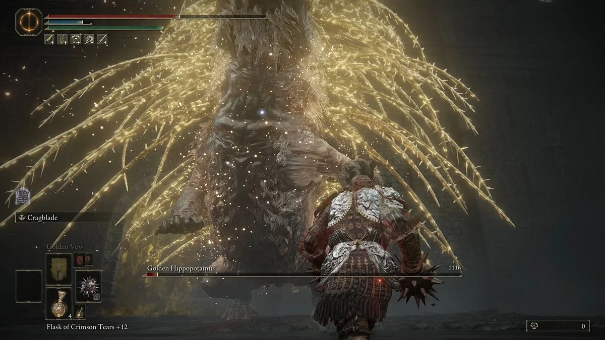 Когда уровень здоровья упадет до 60%, бегемот начнет светится золотым оттенком. Это значит, началась вторая фаза. Из спины босса вылезут длинные иглы, которыми он будет стрелять по кругу. Когда вы увидите свечение, то можете провести пару атак до трансформации. Основные атаки бегемота практически не меняются. Будет только одна новая комбинация, которая состоит из удара по земле и взрыва игр. После каждой такой атаки вы можете спокойно нанести боссу пару ударов.