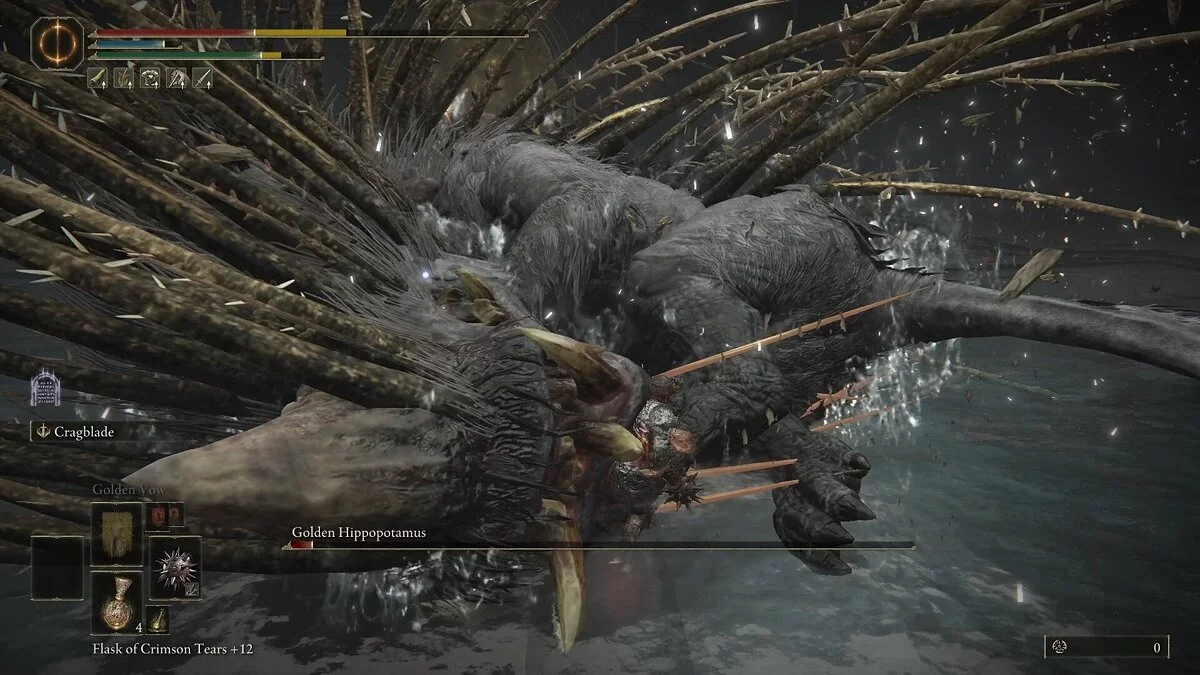 Атаки бегемота довольно прямолинейные. Он невербально сообщает об ударах, раскрывая широко свой рот. Прокатитесь к пасти босса, чтобы избежать попадания. Главное — будьте осторожны, так как противник любит комбинировать быстрые укусы с другими атаками. Как и большинство крупных зверей, бегемот подвержен кровотечению и, конечно, оглушению. Старайтесь использовать атаки с рывком всякий раз, когда у вас есть возможность нанести оглушающий удар.
