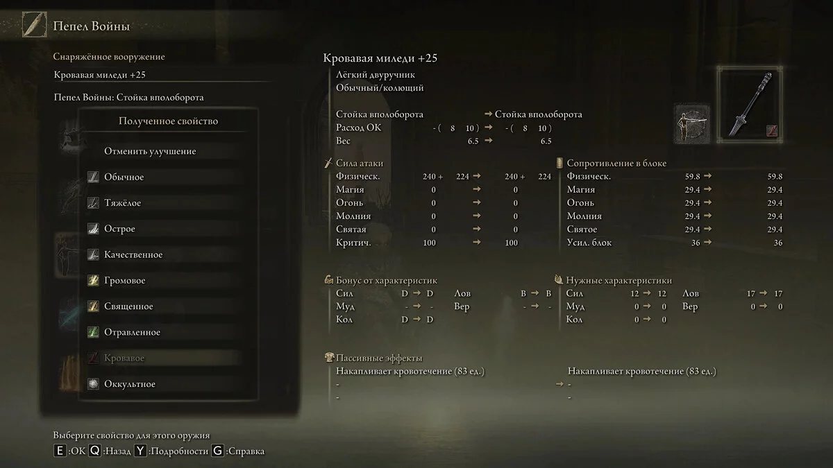 - Оружие: Миледи +25 с пеплом войны «Клинок шторма», Печать пальца;
