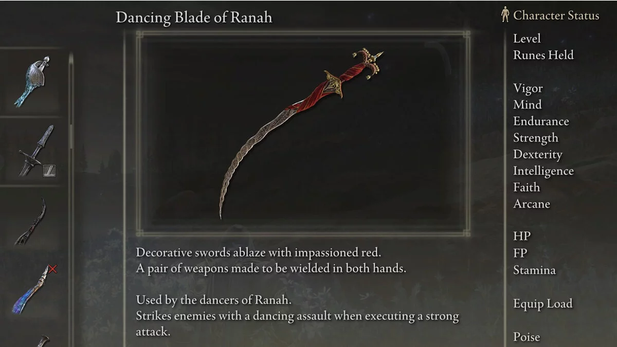 - Оружие: Танцующий меч Ранах +10, Печать пальца;