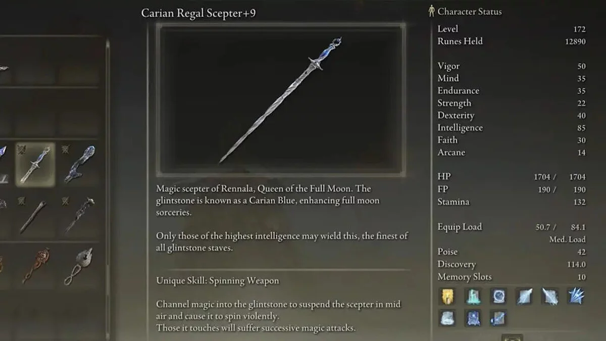 В сборках через мудрость есть всё: дальность, урон и оглушение. Есть три варианта, которыми вы можете реализовать билд через мудрость: чистая мудрость и переход к пути Мага, либо использование Карианского королевского скипетра, который дополняется силой или ловкостью.