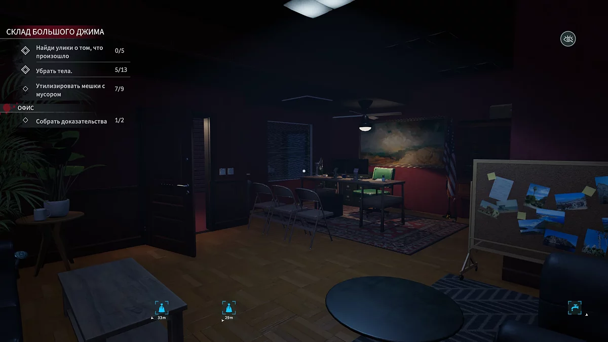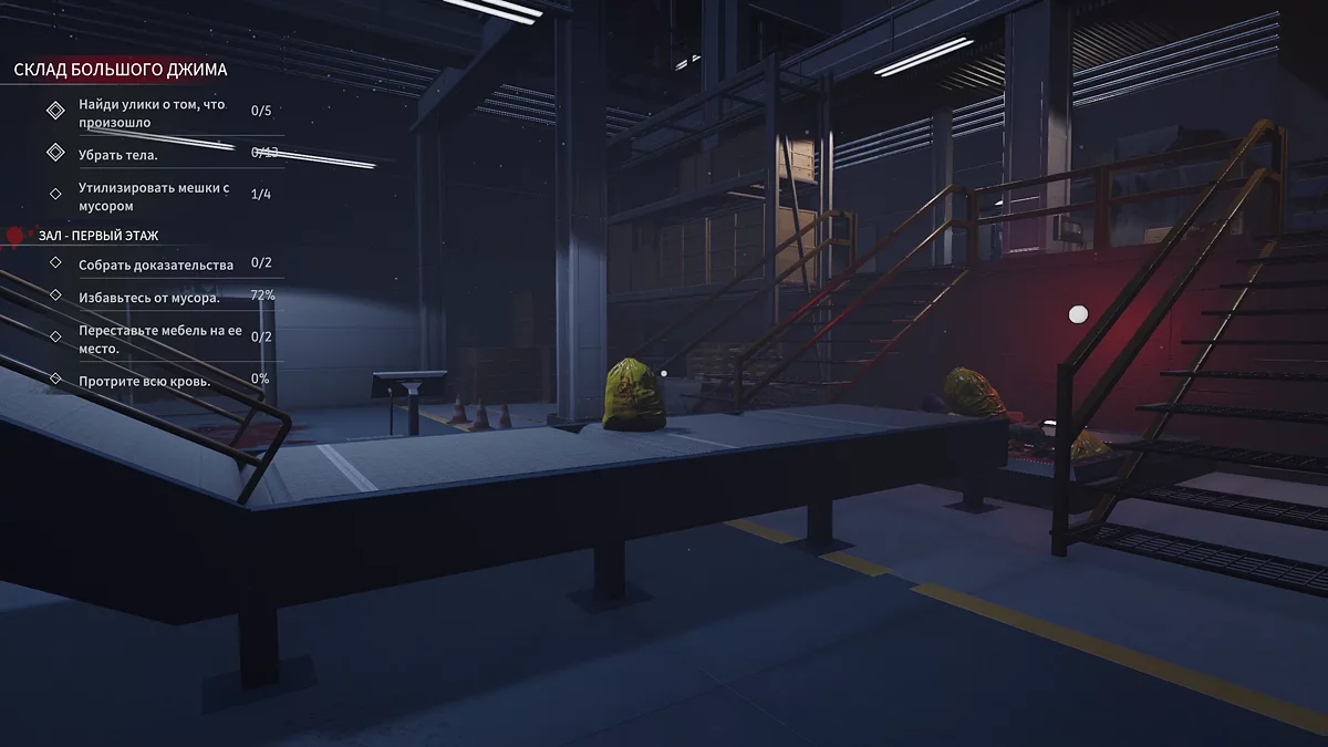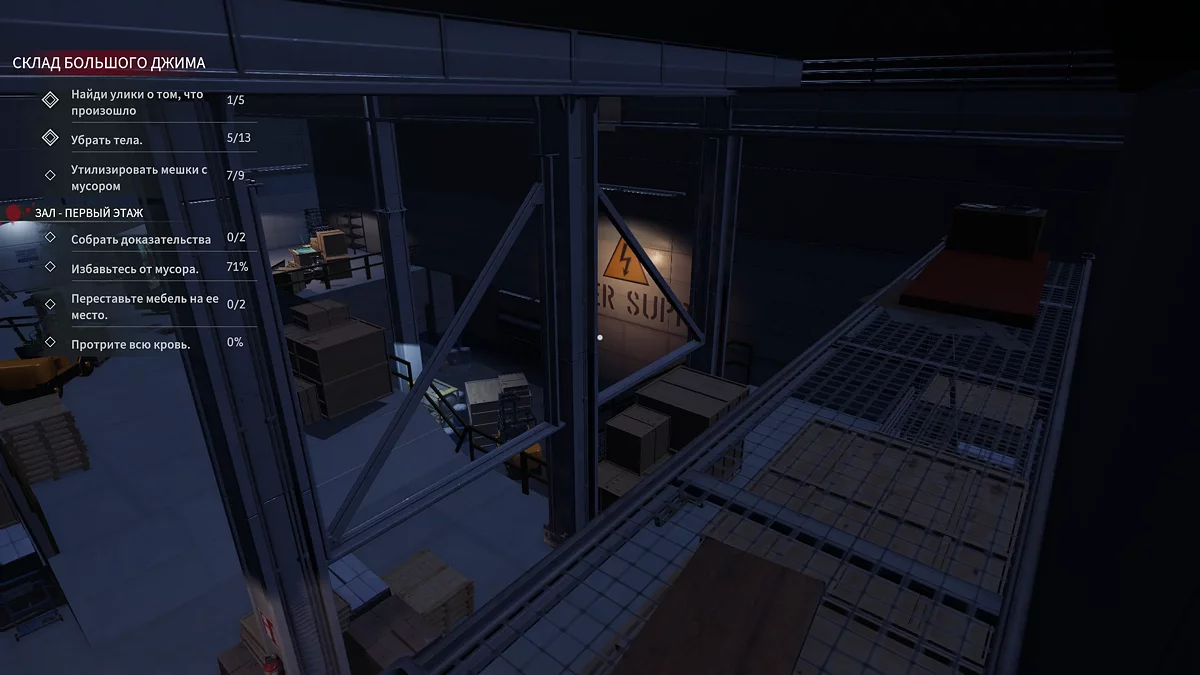 Улику № 1 — MAC-10 можно подобрать сразу, как попадёте в зал на первом этаже. В локации с цветными коробками нужно вернуть на место стеллажи и расставить на них 6 коробок такого же цвета. Одна синяя коробка будет висеть на светильнике под потолком. В остальном всё находится недалеко от места падения. На первом этаже остаётся только отмыть грузовик с крадеными картинками. Там же будет улика № 2 — телефон. После этого по транспортировочной ленте поднимайтесь выше. По пути сбросьте все ящики, чтобы они не мешали вывозу мусора.