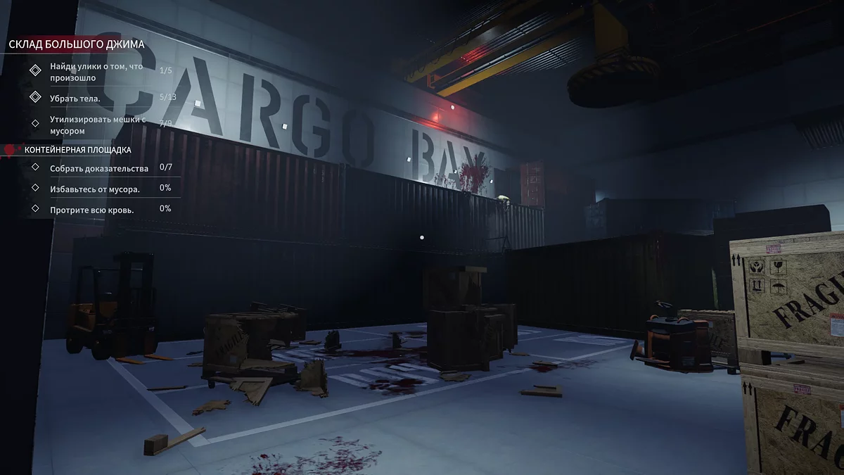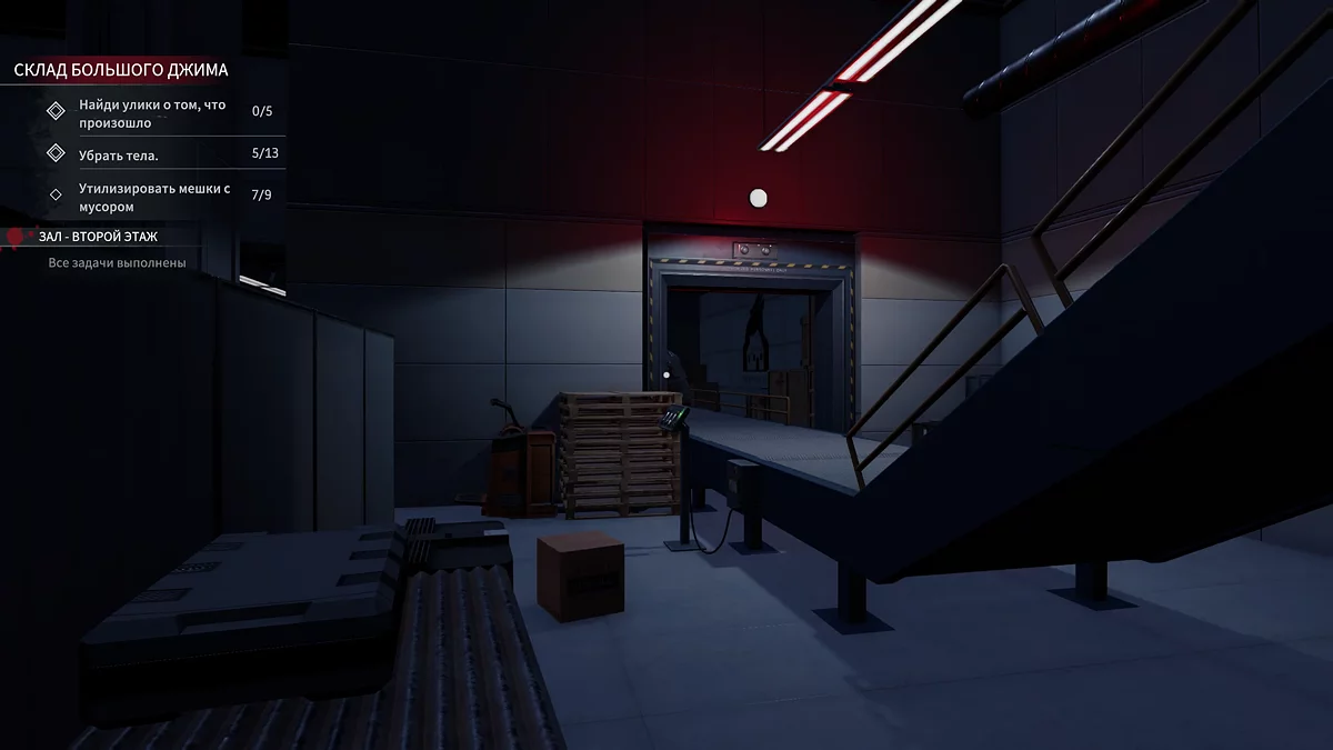 С другой стороны завода будет закрытая контейнерная площадка, но и в этом месте нужно навести порядок. Возле боксов будет лежать тело и улика № 4 — пистолет. Закончив, возвращайтесь в комнату управления, выключите люк и ленту, чтобы безопасно активировать лифт. Трупы и мусор в него лучше не заносить, поскольку предметы могут провалиться под текстуры, но на лифте можно подняться на второй этаж.