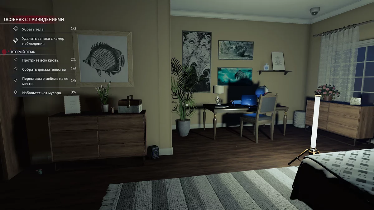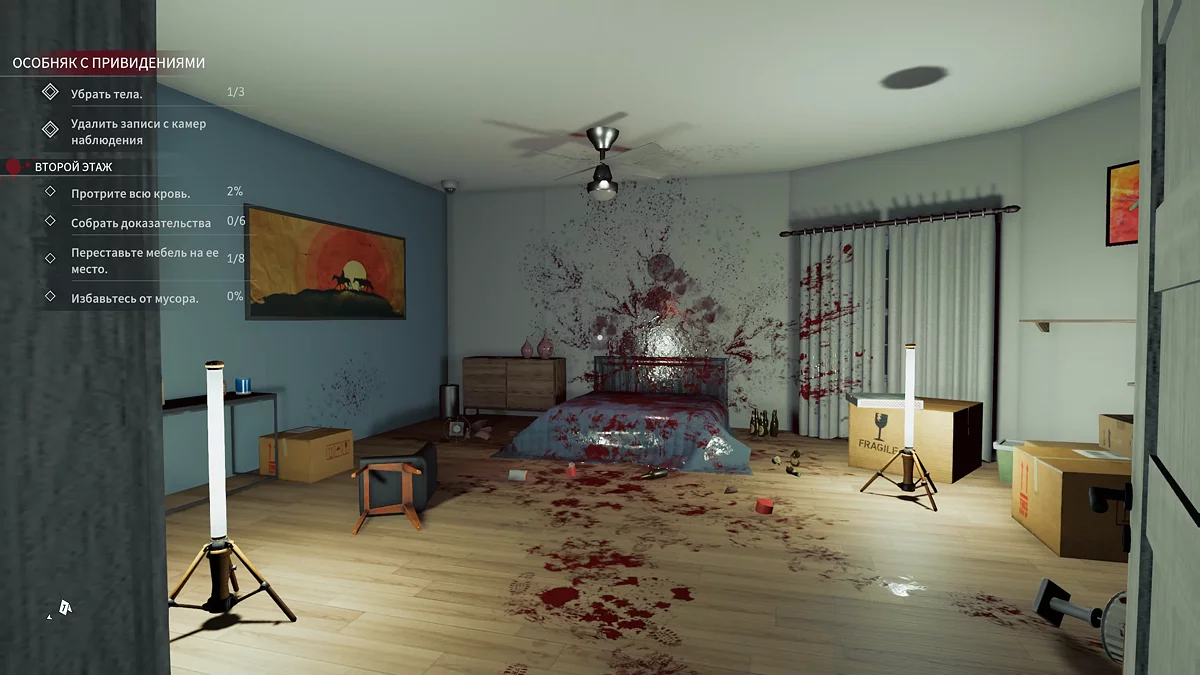 В комнате достаточно темно и много хрупких предметов. Поэтому установите осветительные приборы и воспользуйтесь губкой для уборки. Если озонатор закончил свою работу, можете поставить его ещё глубже в комнаты, в которые отправитель позже. Слева от кровати будет улика № 4 — телефон. В процессе уборки вы найдёте два светильника. Один из них должен стоять у предыдущей улики, второй на столе у левой стены. Рядом нужно поднять синий стул.