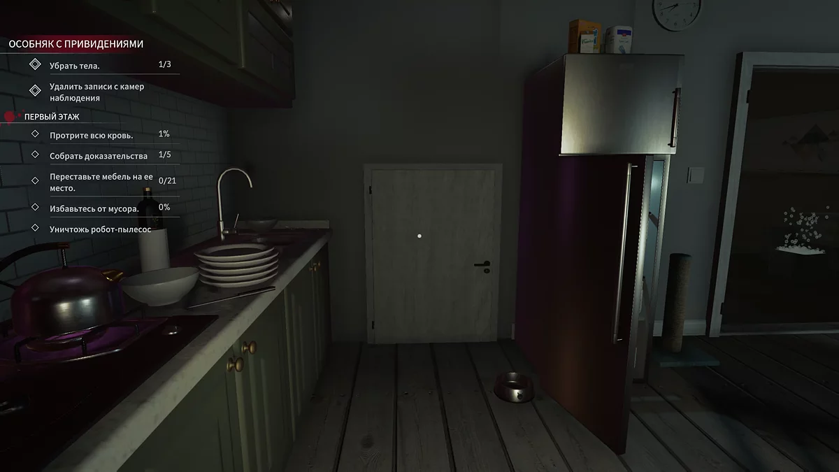 В кошачьей комнате появились следы. Отмойте их и уберите разбитый алкоголь, а за оставшимися бутылками подберите улику № 11 — умная колонка. Расставьте оставшиеся вещи по своим местам, поправьте картины и, если всё ещё не вытерли всю кровь, проверьте потолки. Ещё раз зайдите в кошачью комнату и уберите новые следы.