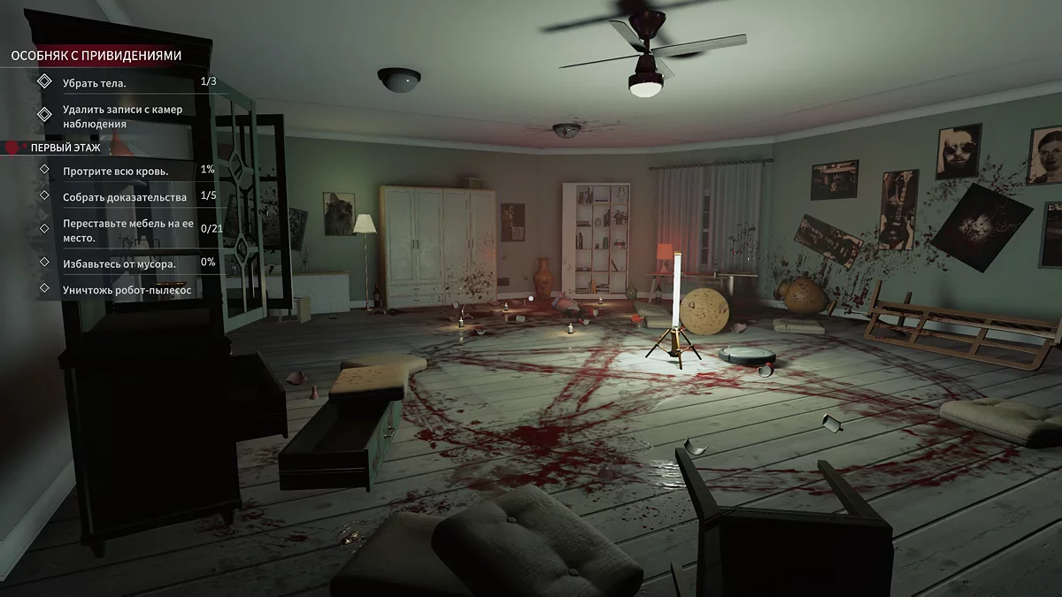 Оказавшись в доме, поверните налево, куда упал мяч. Протрите его и подберите у стула улику № 1 — умная колонка. Первый этаж закрыт, кроме ванной комнаты, поэтому очищаем лестницу и поднимаемся выше. Продвиньтесь в центр коридора и поставьте озонатор, который упростит дальнейшую уборку. Справа от лестницы видны кровавые следы, ведущие в стену, за которой находится секретная комната, как её открыть расскажем позже. В углу у этой стены будет улика № 2 — умная колонка. Подбирайте в центре коридора улику № 3 — крест и заходите в первую спальню, справа от лестницы.