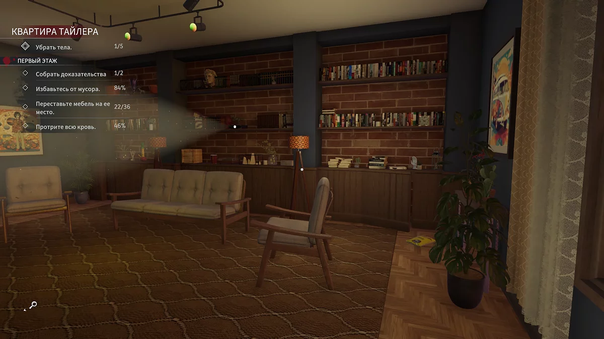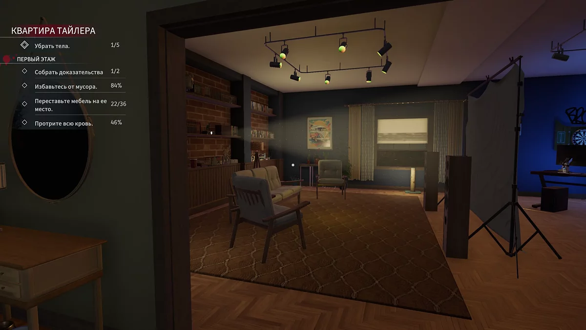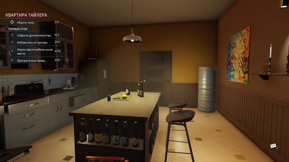 Для начала откройте все двери и уберите мусор. Его здесь достаточно много, что будет отвлекать от мытья полов и установки предметов. На кухне справа подберите кассету № 1 — THE END. В центр нужно вернуть два барных стула, а в угол комнаты установить пивную бочку. Избавьтесь от трупов и подберите в комнате на ковре улику № 1 — телефон.