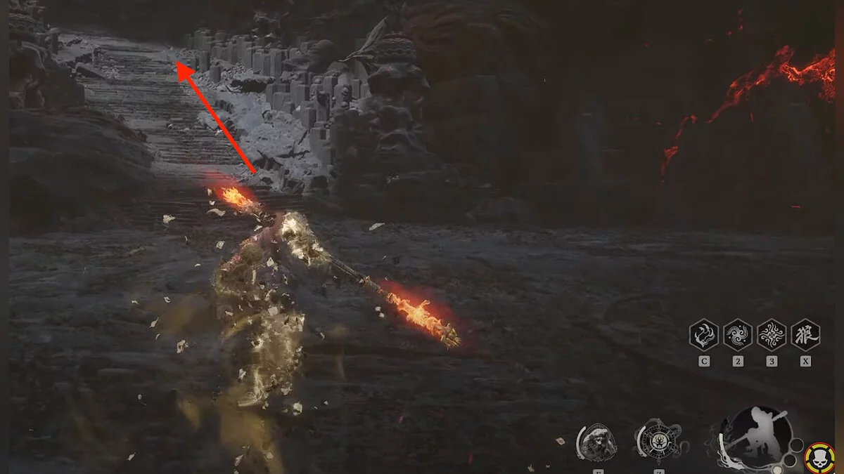 Перемістіть до вівтаря «Печера Бішуй, Яма очищення», розверніться і спускайтеся по сходах зліва, поки не дійдете до території в центрі. Потім перетніть її до зазначеного на зображенні підйому.