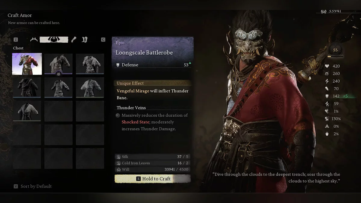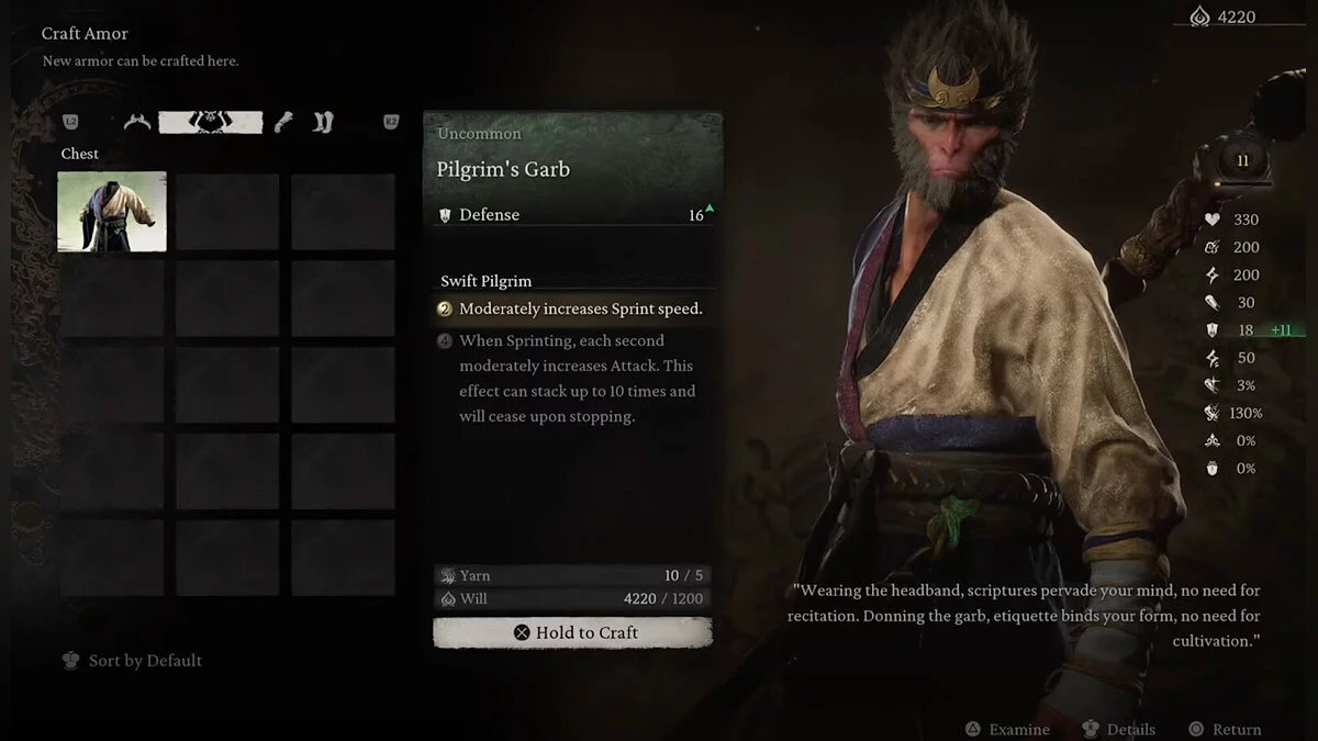 Одні з найперших речей у грі, які можна створити після боса Лін Сюй-цзи та храму Гуаньінь на Горі Чорного вітру, тобто вже після першої глави. Якщо ви хочете покращувати броню, то вам буде необхідно відкрити Намальоване королівство після перемоги над Пожилим Луном у 3 главі.