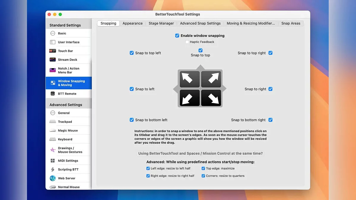 Однією з ключових функцій BetterTouchTool є управління розташуванням вікон за допомогою налаштовуваних комбінацій клавіш. Ця функція пропонує користувачеві гнучкість в організації робочого простору і значно перевершує стандартну систему управління вікнами macOS.